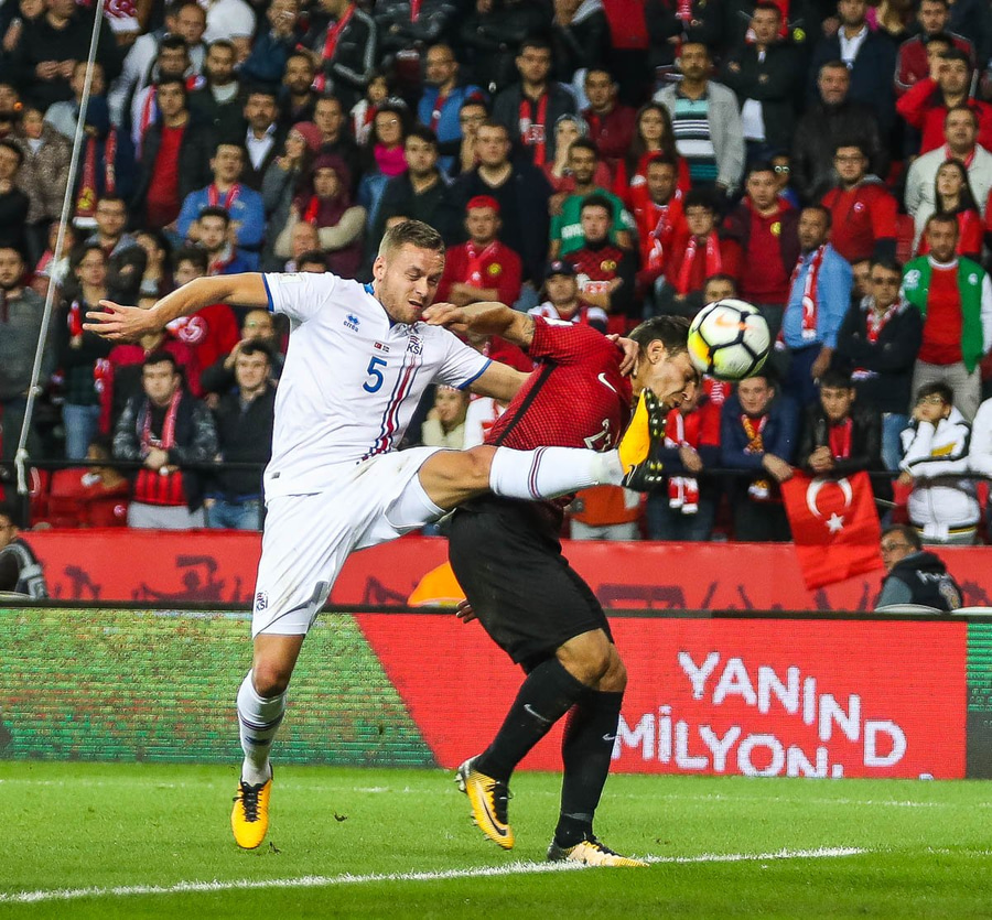 Tyrkir að sækja. Kári hreinsar boltann frá en áfram halda Tyrkir að setja pressu. Okkar menn verjast fimlega.