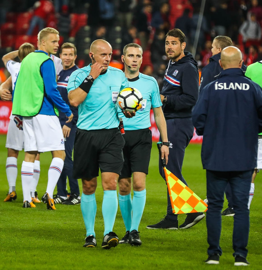 Dómari leiksins er Pólverjinn Szymon Marciniak. Hann dæmdi sigurleik Íslands gegn Austurríki á EM í fyrra þar sem Arnór Ingvi Traustason skoraði flautumark sem tryggði Íslandi leik gegn Englendingum í Hreiðrinu í Nice.