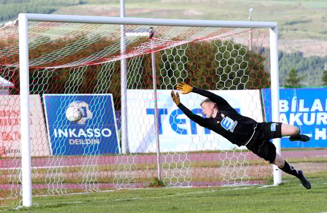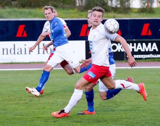 Þórsarar fá hér aukaspyrnu á hægri kantinum, Aron með lúmska spyrnu sem skoppar í teignum í gegnum miðjan pakkann og aftur fyrir. Þarna hefði bara þurft stóru tánna í boltann!