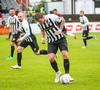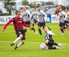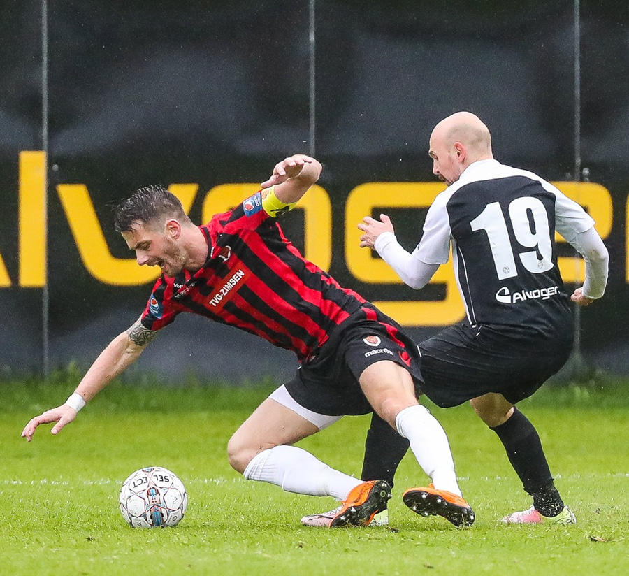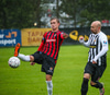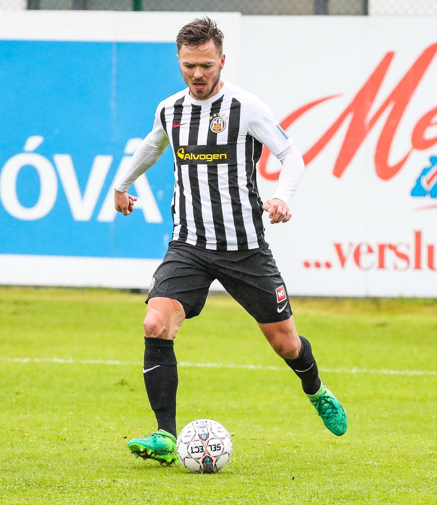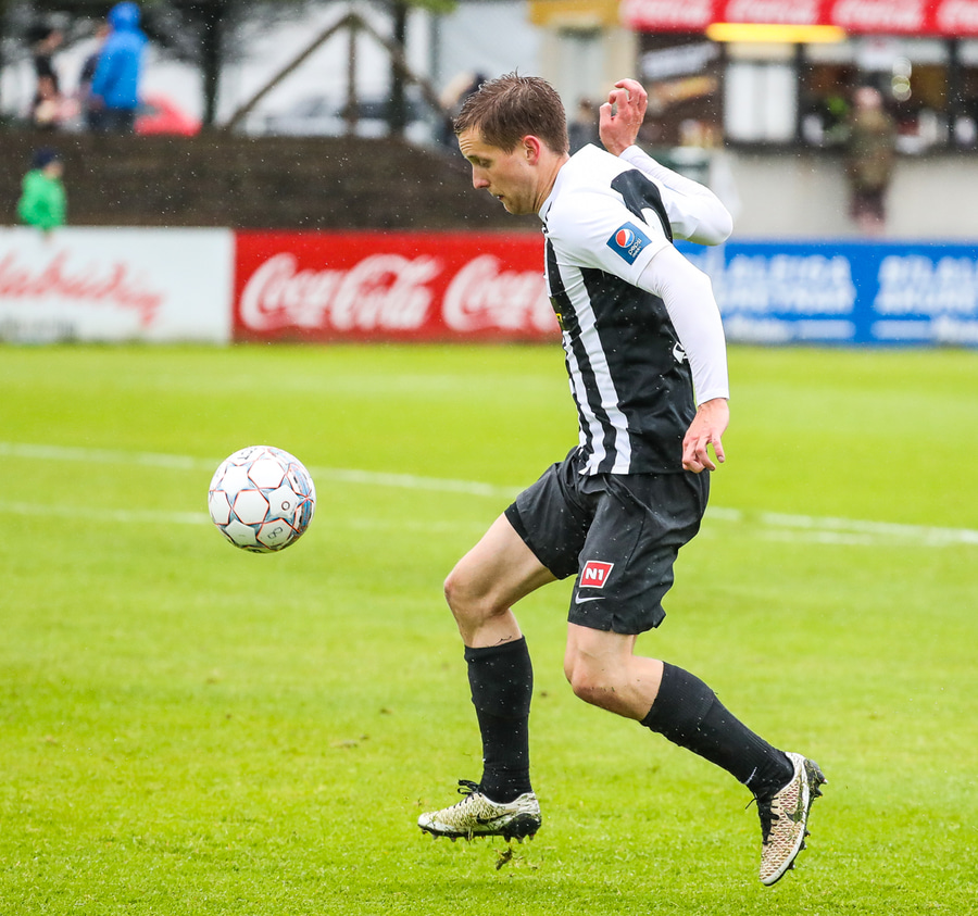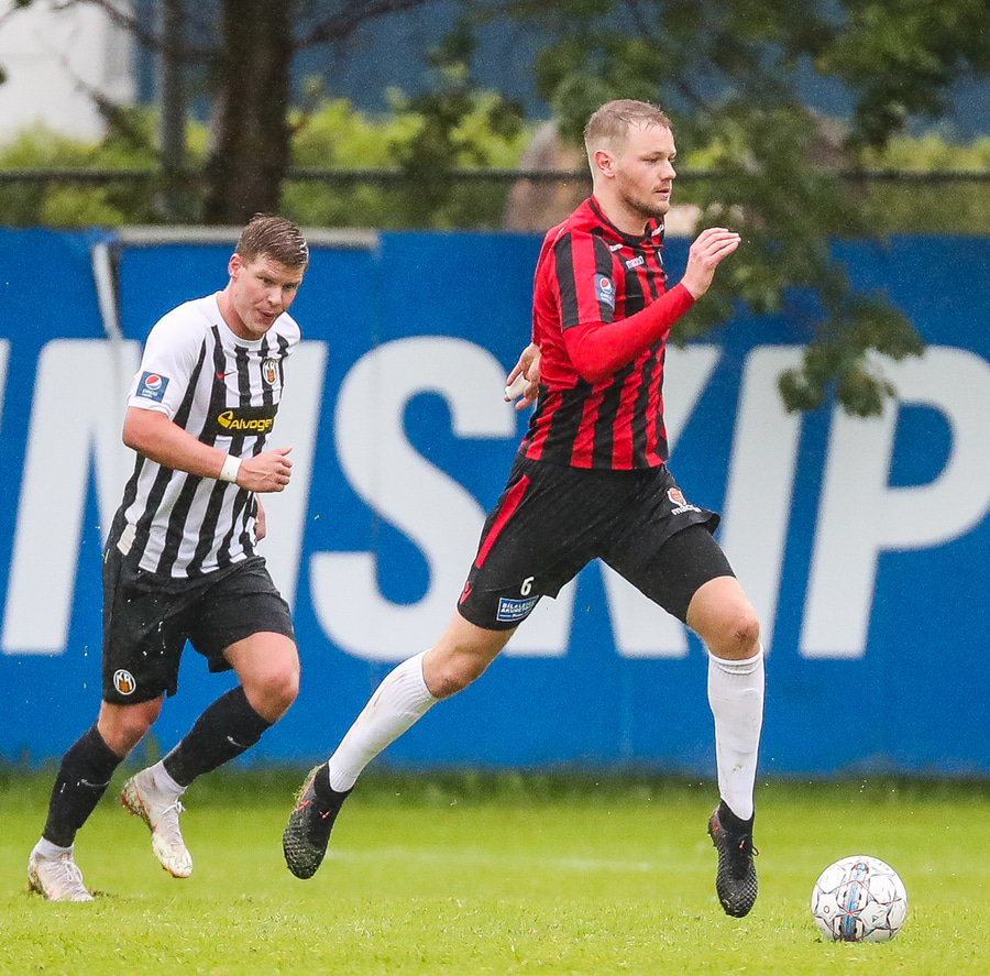 Tók 20 sekúndur að fá fyrstu tæklinguna á rennblautum vellinum, Finnur Orri hendir sér í eina góða og tekur niður Alex Frey á miðjum vellinum.