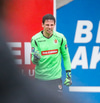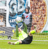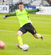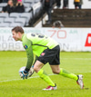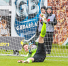 Bjerregaard getur ekki skorað fótboltamark hér í kvöld, dauðaskallafæri en skallinn gripinn af Larsen.