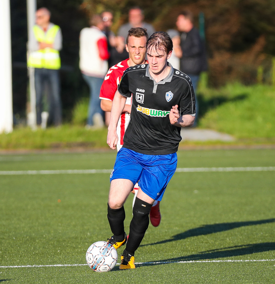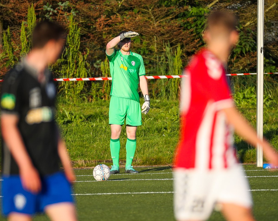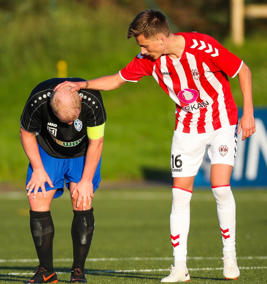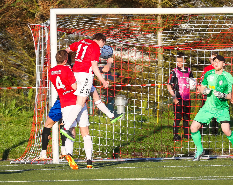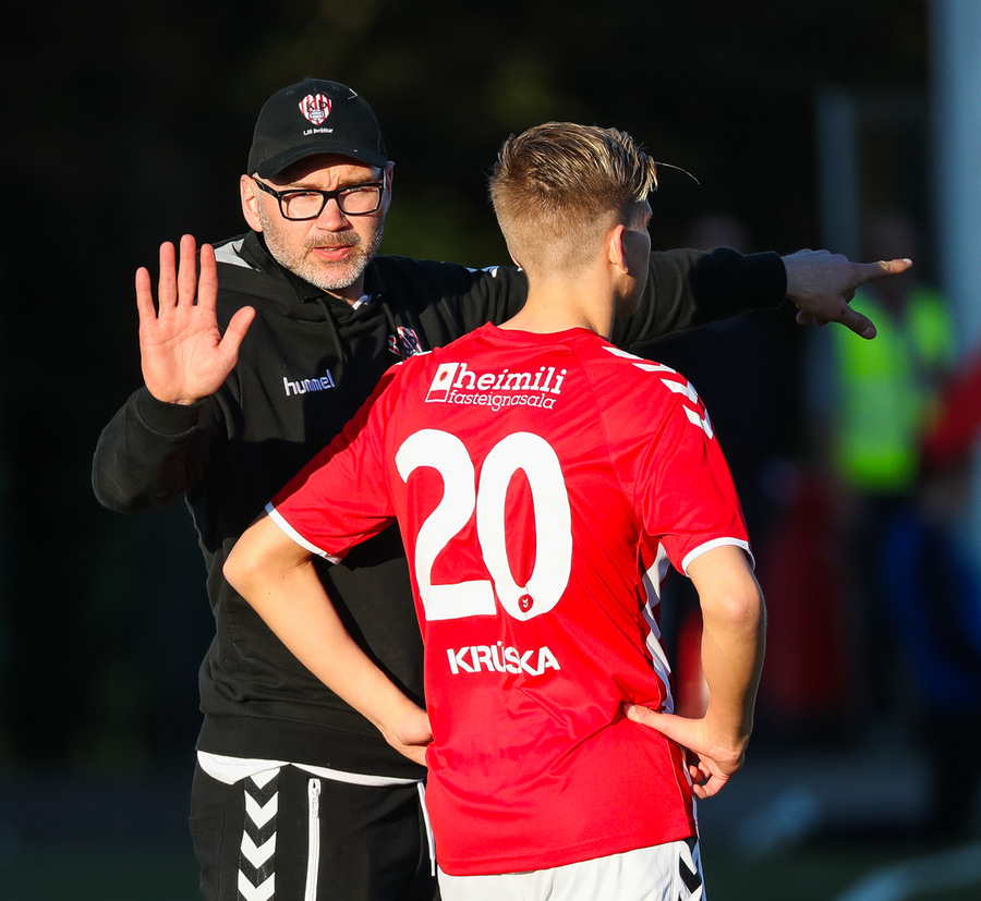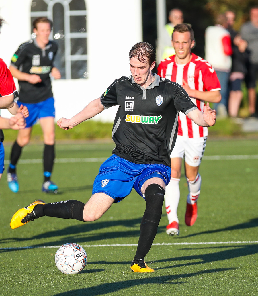 Aftur kemur fyrirgjöf frá Jasper og aftur er Viktor að gera sig breiðan í teignum en nú nær Már að stoppa hann. Már liggur eftir, þeir virðast hafa skallað saman. Ef ekki væri fyrir Má þarna væri staðan 2-0.