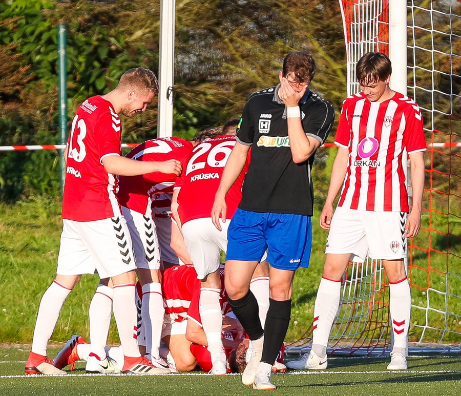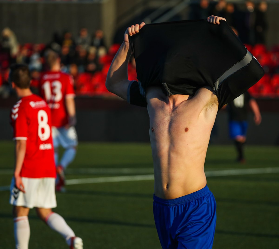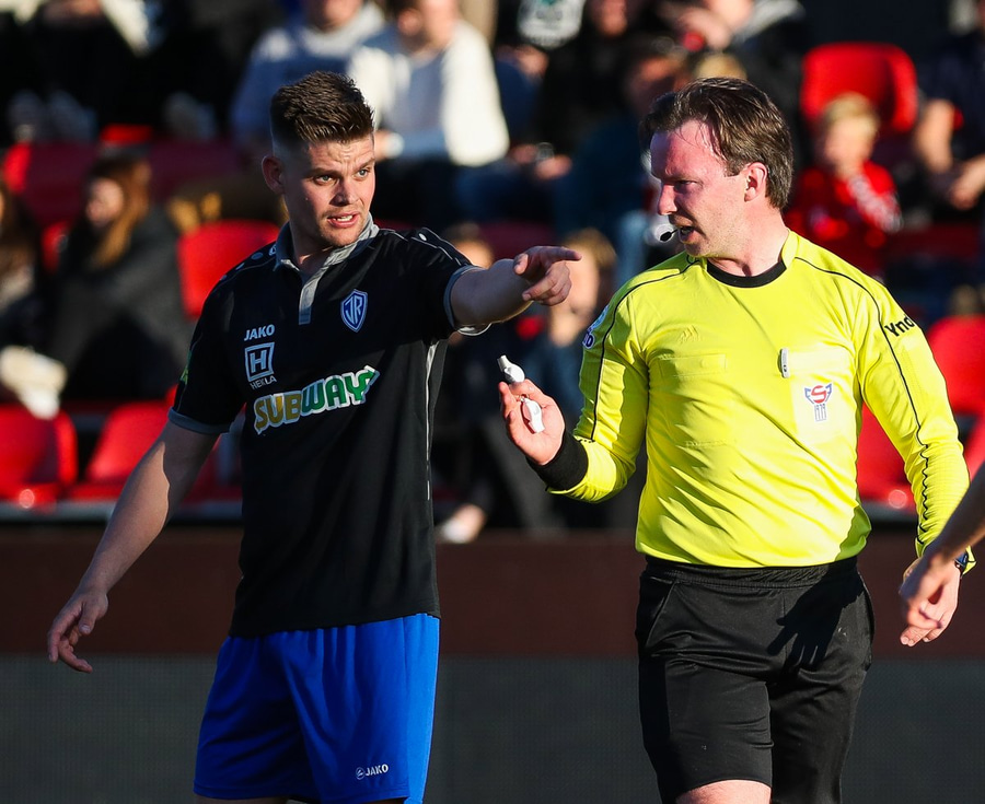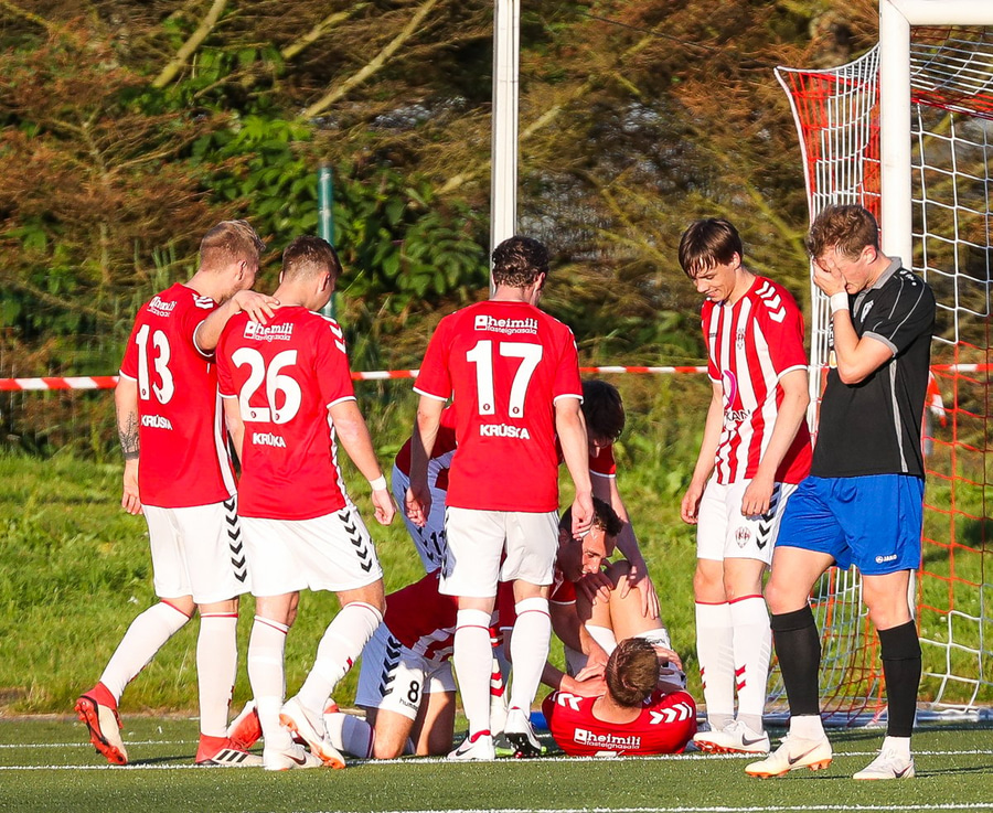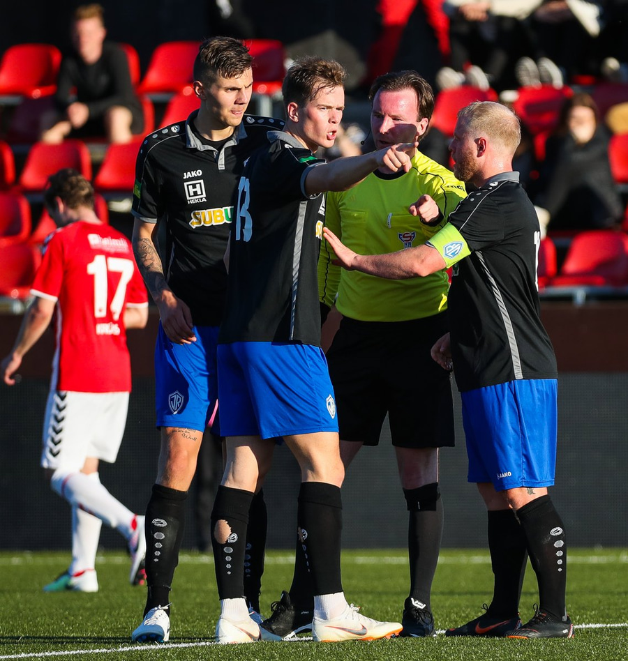 Guffi fer niður og vill fá aukaspyrnu sem hann fær ekki og segir nokkur vel valin orð á færeysku við dómarann.