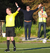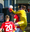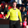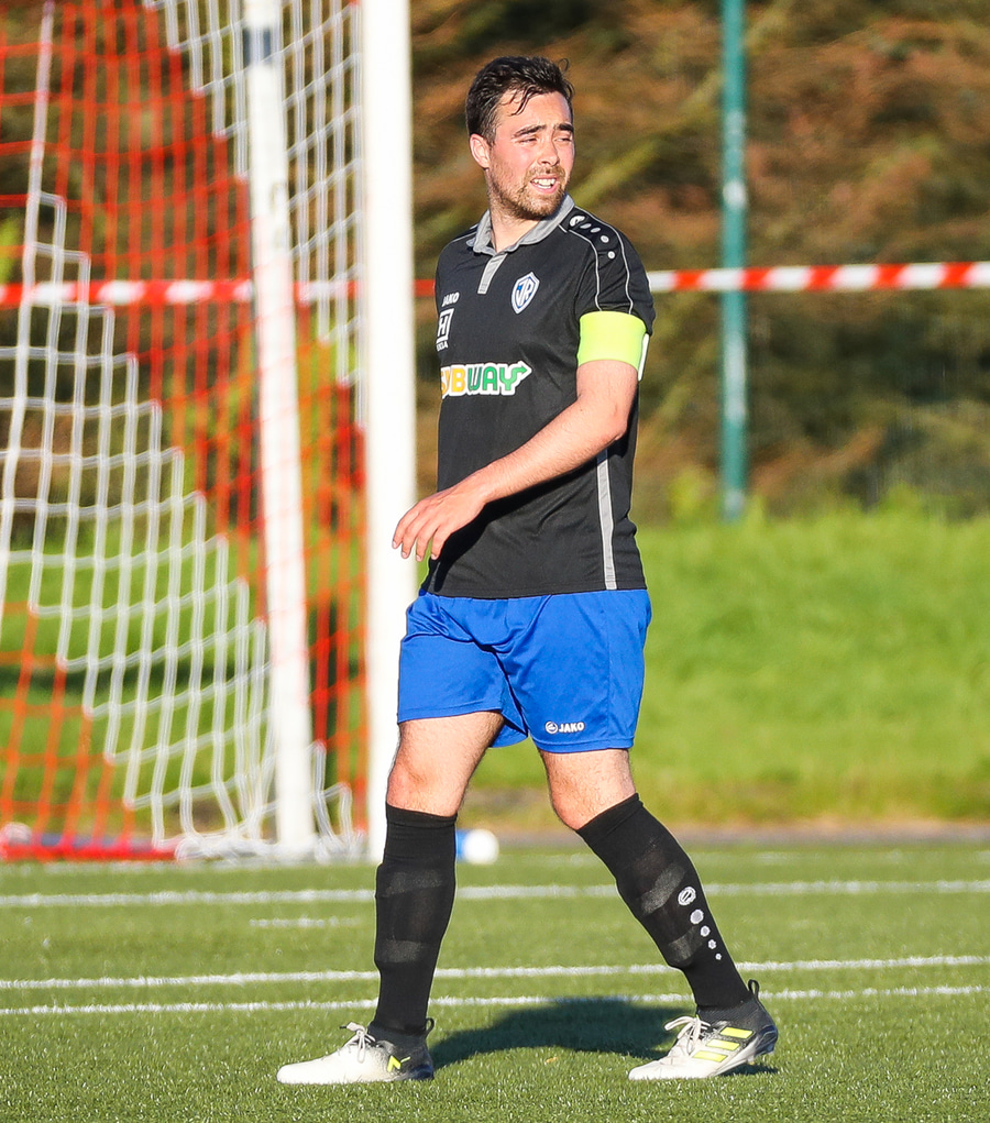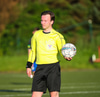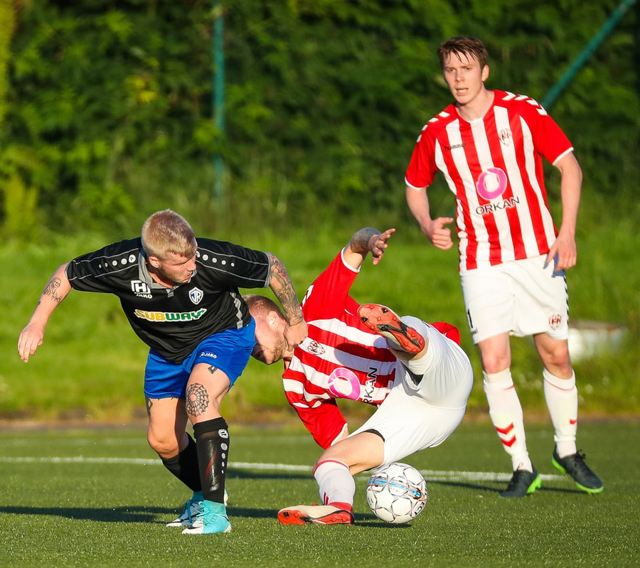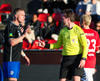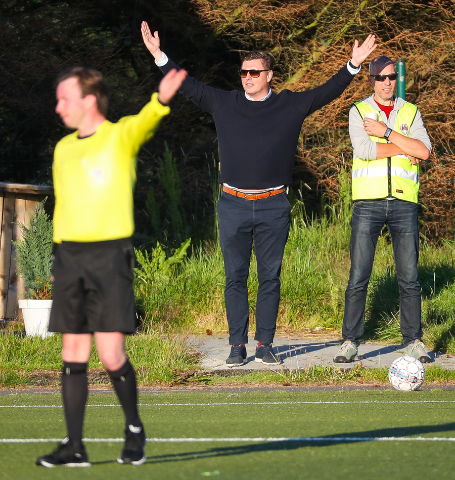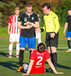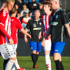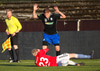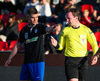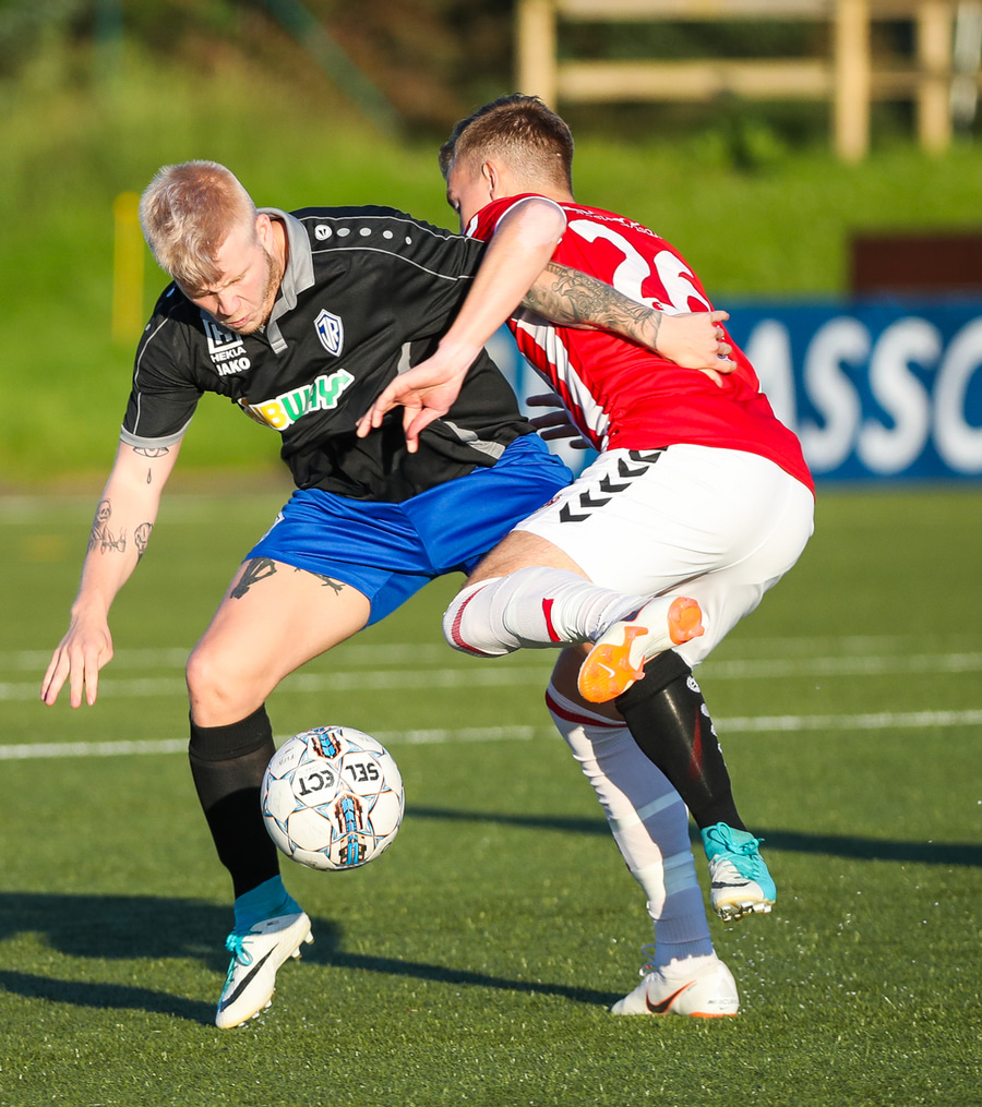 Guffi fer niður og vill fá aukaspyrnu sem hann fær ekki og segir nokkur vel valin orð á færeysku við dómarann.