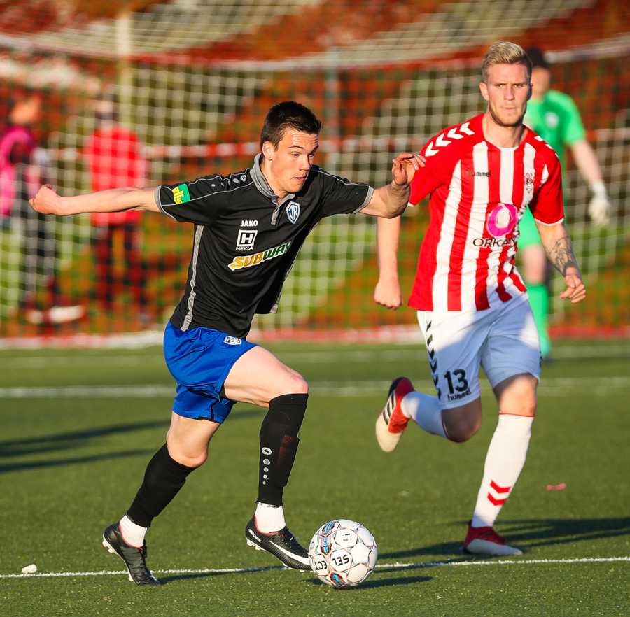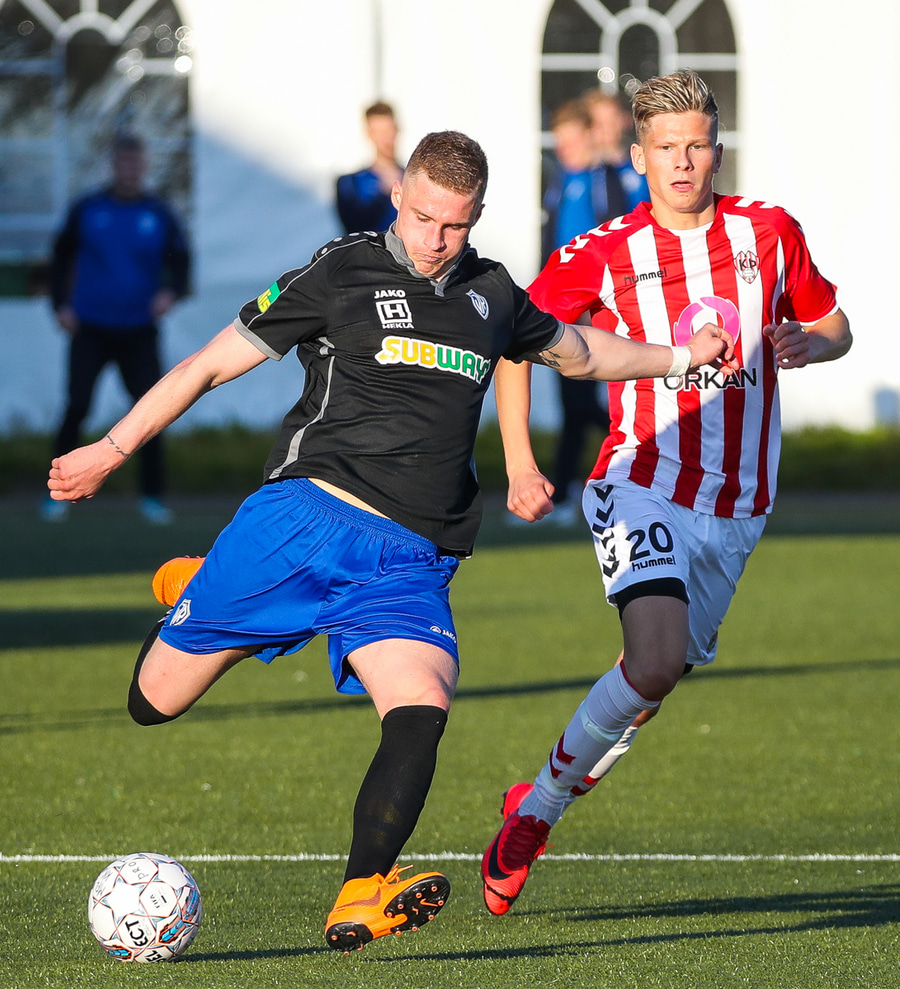Axel með geggjaðan sprett og skilur Finn Tómas eftir í rykinu. Hann er nánast kominn einn á móti markmanni en touchið svíkur hann og Birkir Þór hendir sér í eina tveggja fóta inn í teig og tekur bara boltann. Það þurfti kúlur til að henda sér í þessa tæklingu.