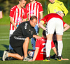 Menn liggja hérna útum allan völl, flestir með þjóhátíðarkrampa sýnist mér en Stebbi Páls þarf að yfirgefa völlinn vegna meiðsla sem líta ekki vel út.
