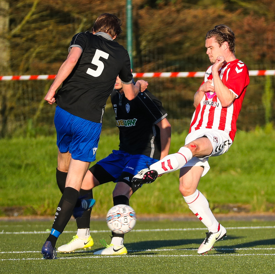 Fyrsta tilraun gestanna. Gísli Martin fær boltann fyrir utan teig og ætlar að snúa hann í fjær en skotið ekki nógu gott.
