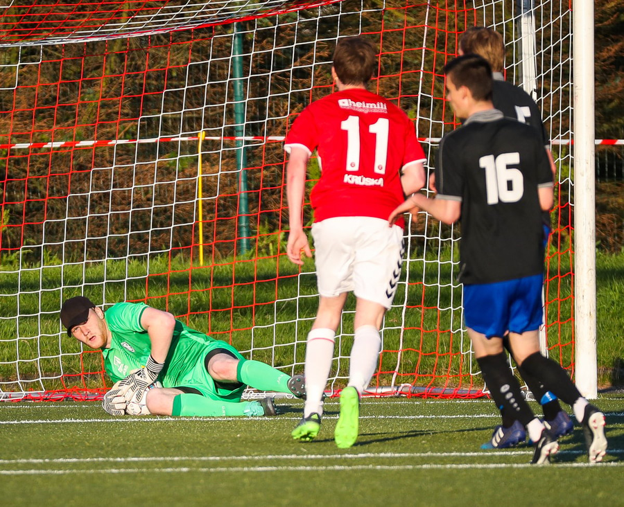 Kristó Konráð langar að vara með í veislunni og reynir langskot sem Helgi á ekki í miklum erfiðleikum með.