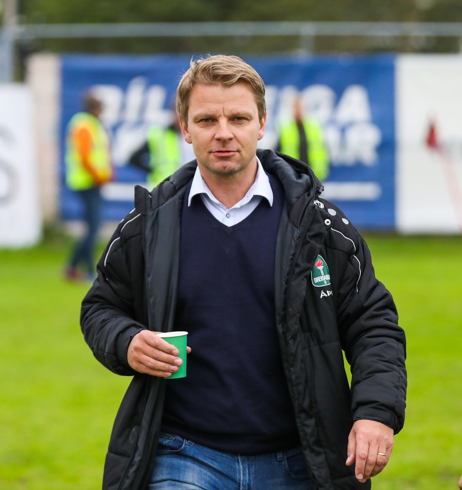 Rólegt yfir þessu hér í blábyrjun en Jörgen liggur í grasinu eftir baráttu um boltann og fær aðhlynningu. Smá kæling og hann er í lagi.