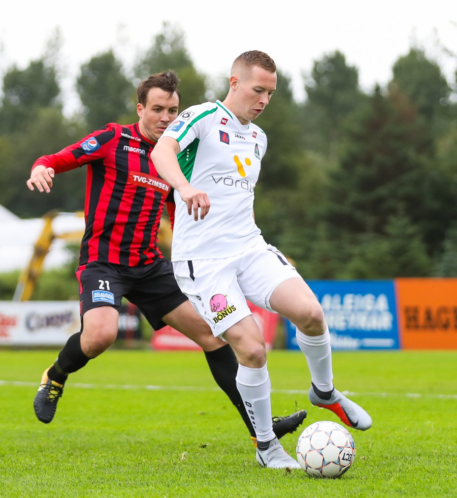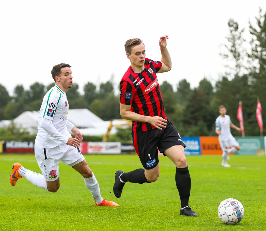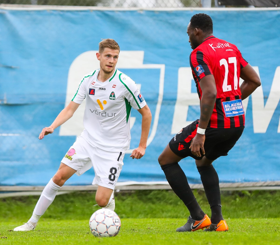 Davíð Örn grimmur í baráttunni og vinnur boltann. Brunar upp hægri vænginn og á fyrirgjöf en Gulli búinn að lesa hana fyrir löngu.