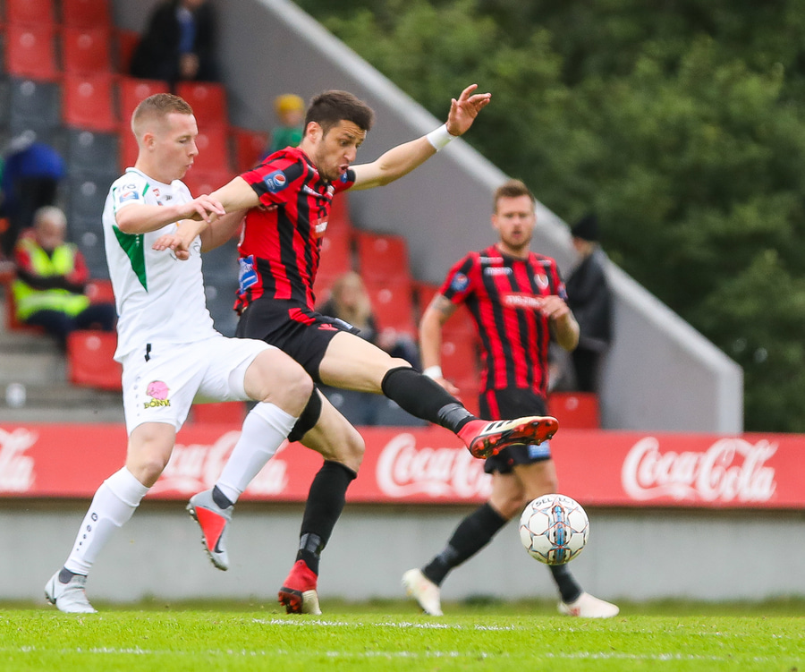 Boltinn í neti Víkinga, En ólöglega, Larsen grípur fyrirgjöf en fær Mikkelsen á fullri ferð í sig og missir hann. Sigurður Hjörtur flautar og dæmir brot.