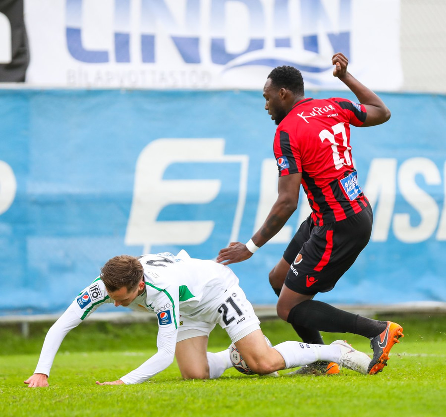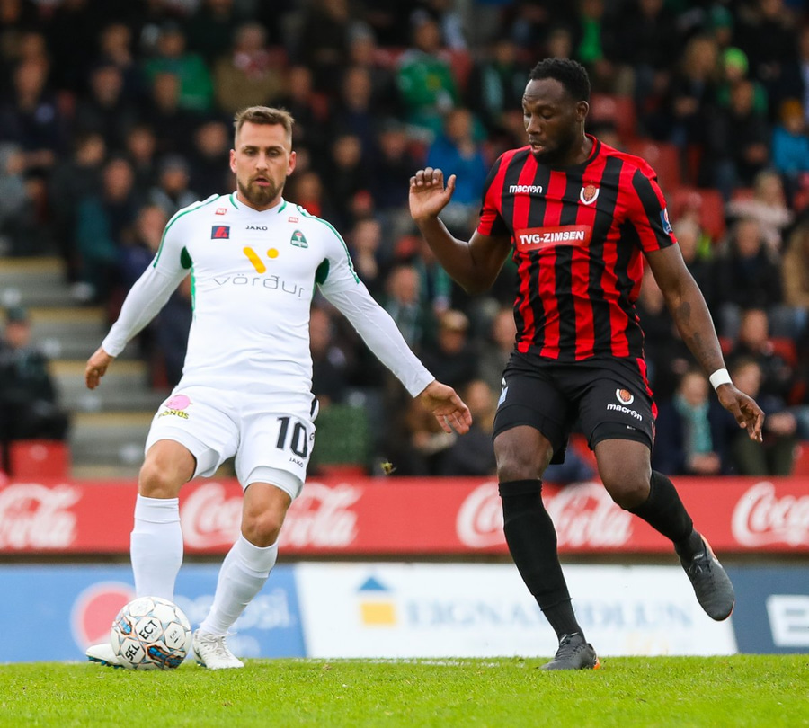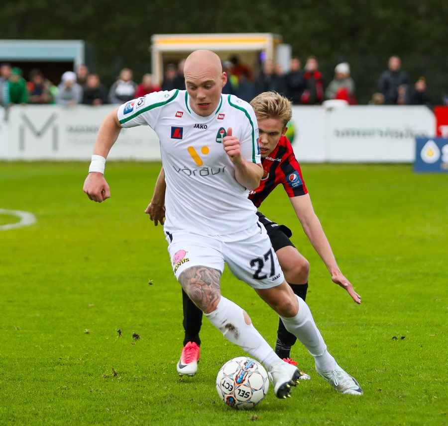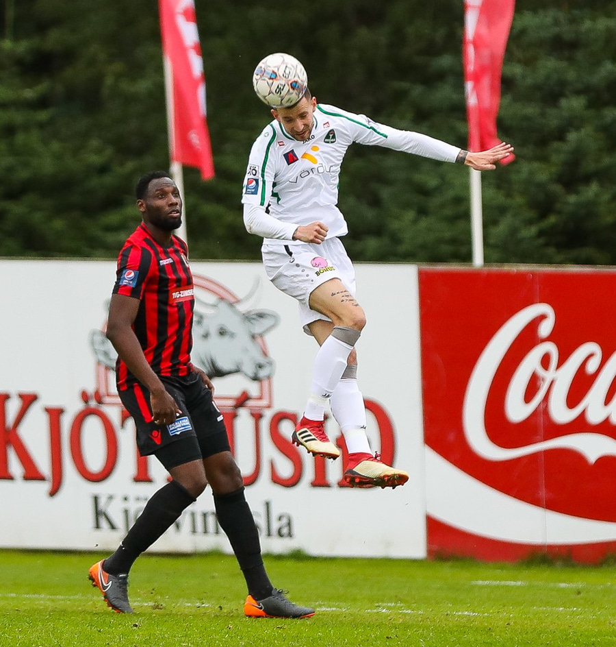 Gott og snöggt spil Víkinga upp vinstri vænginn en Damir kemst fyrir fyrirgjöf Jörgens. Castillion lúrði rétt fyrir aftan hann.