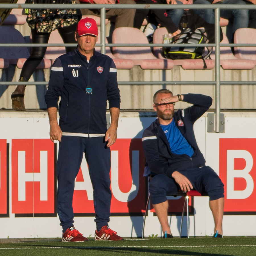 Um það bil fimmtán mínútur þar til að Marco Fritz dómari flautar þennan leik á og leikmenn hafa fengið sig fullsadda af upphitun. Fá nokkur vel valin orð frá þeim Óla Jó og Goran Sabilic áður en að leikurinn hefst. Ég er spenntur og ég treysti á að þið séuð það líka kæru lesendur.