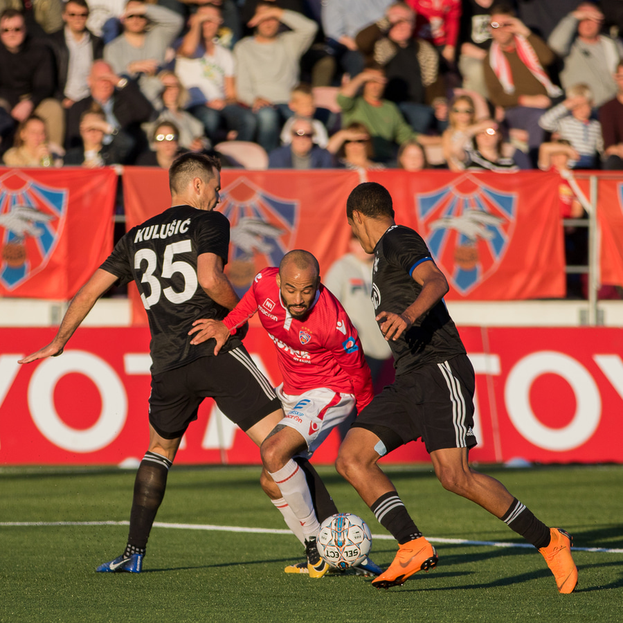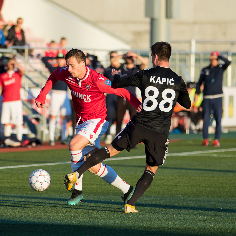 Dion Acoff vinnur hér boltann af Posmac og nær stungusendingu á Patrick Pedersen sem er sloppinn einn í gegn. Hann er hins vegar flaggaður rangstæður. Þetta virtist ansi tæpt.