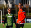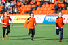 Þá labba liðin á völlinn. Fylkir í sínum iconic appelsínugulu búniningum og Valur í geggjuðu grænu varabúningunum sínum. Væri hægt að breyta þessu í tískusýningu hérna í Árbænum.