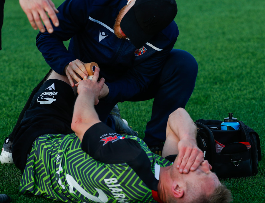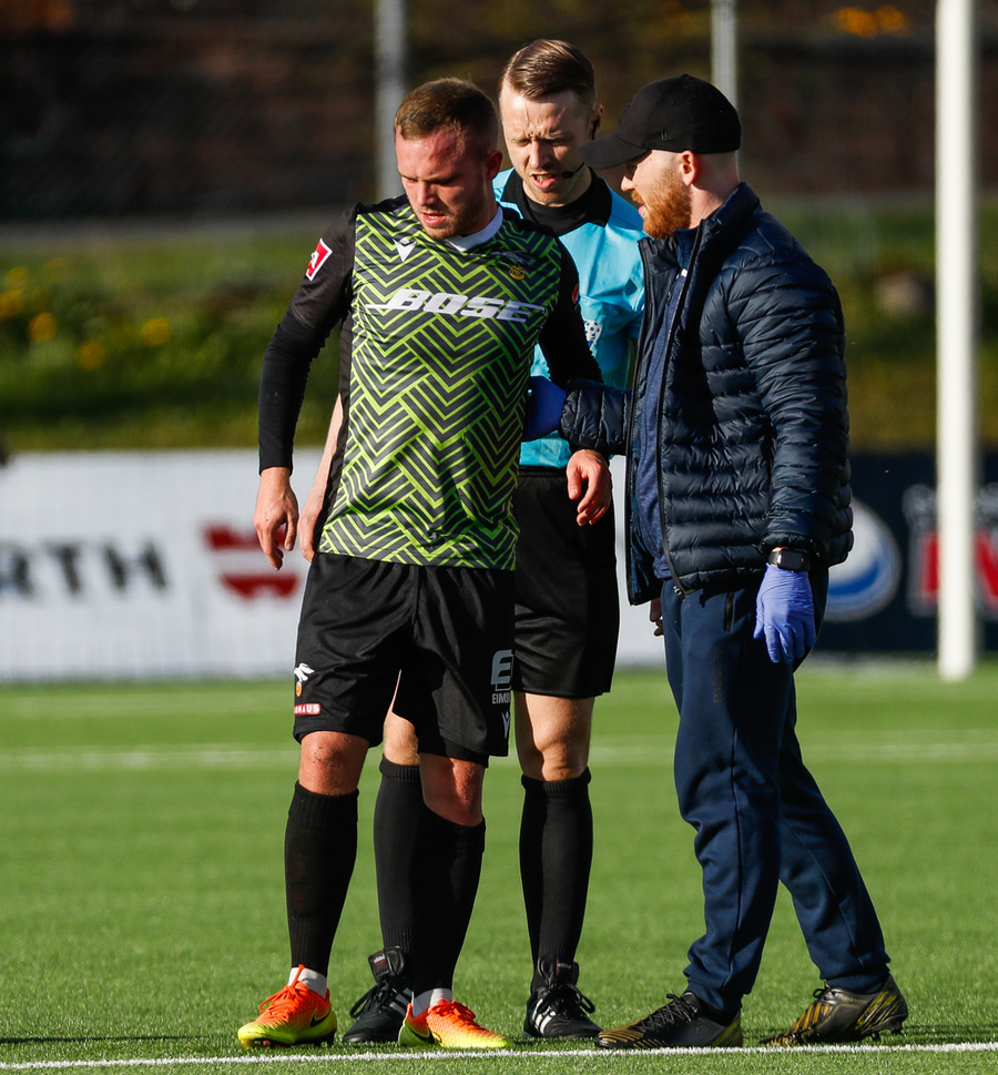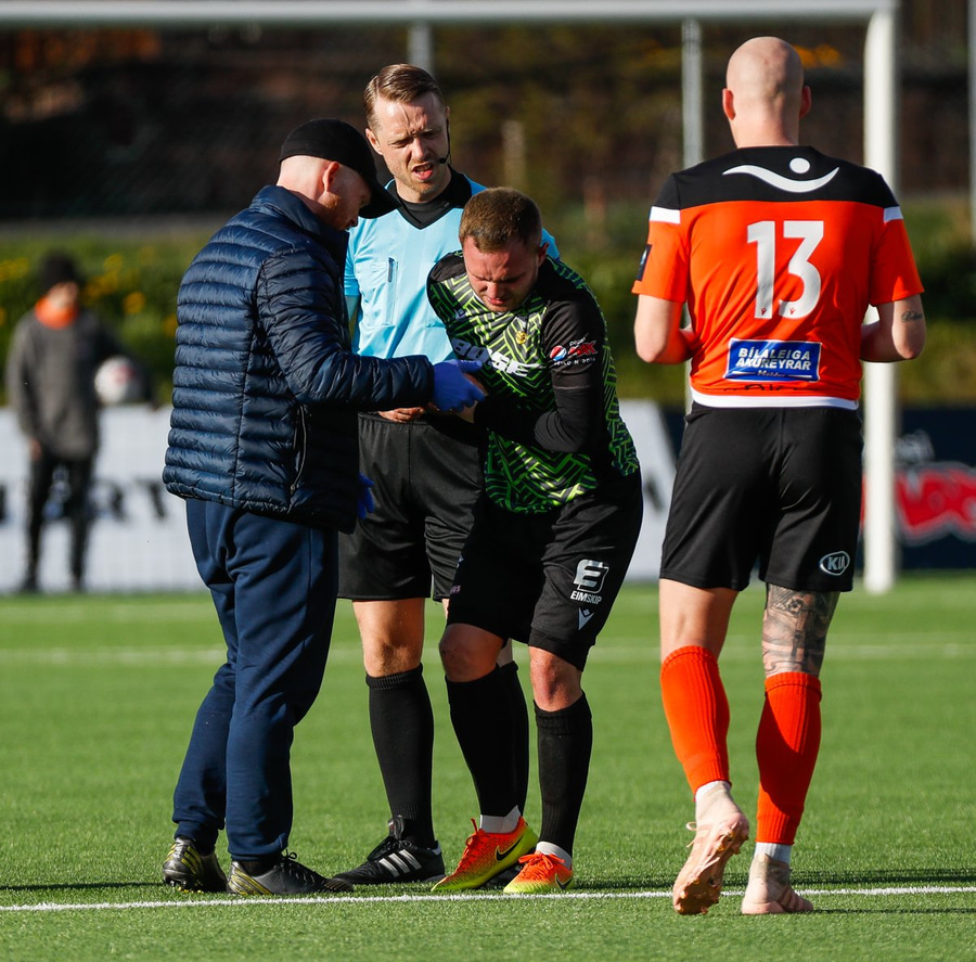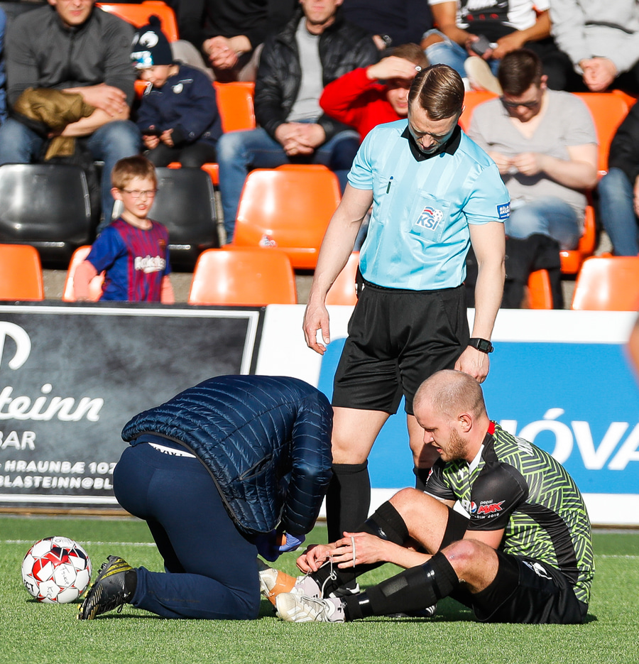 Kristinn Ingi fær hér mann inná völlinn til að reima fyrir sig. Einhver er innkoman.