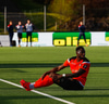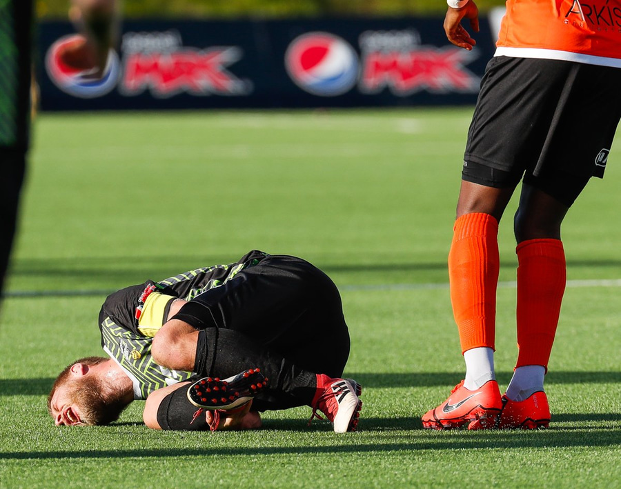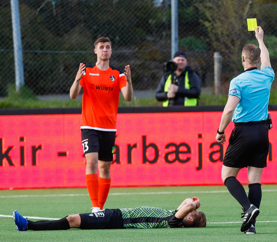 Andri Adolphsson sparkar hér í gervigrasið og liggur eftir. Þetta leit út fyrir að vera sárt.