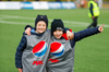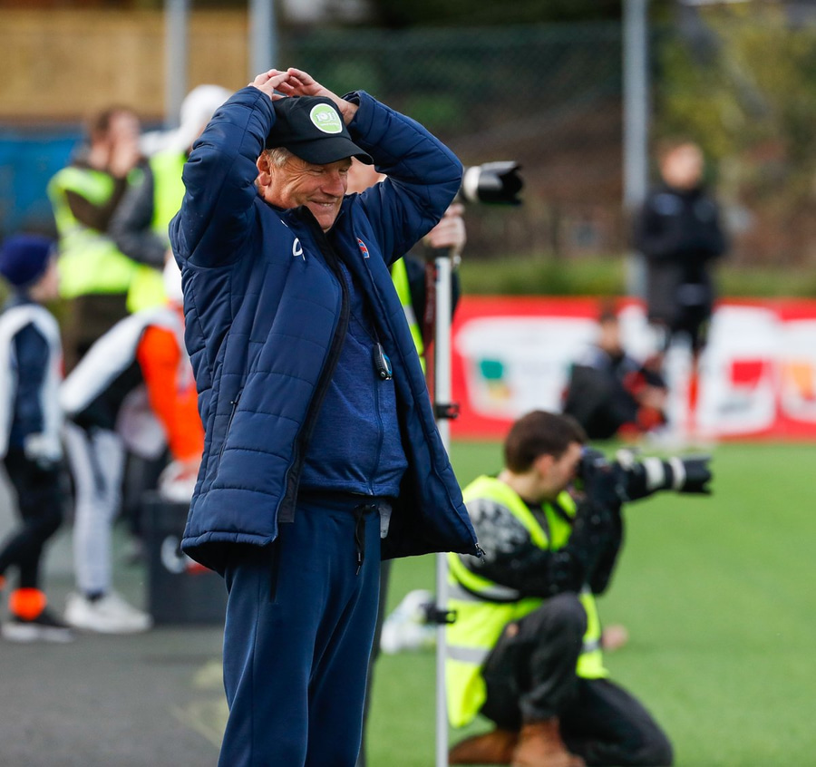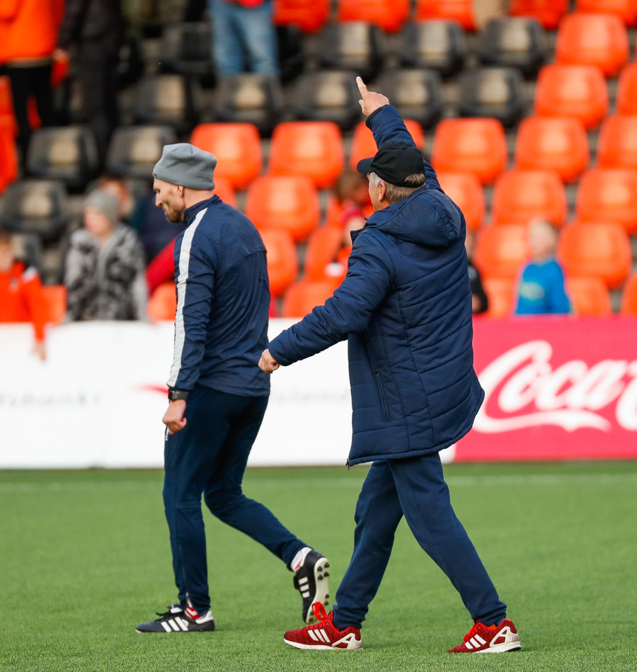Liðin mætt út á völl í upphitun og dyggir stuðningsmenn mættir í stúkuna. Það er passion.