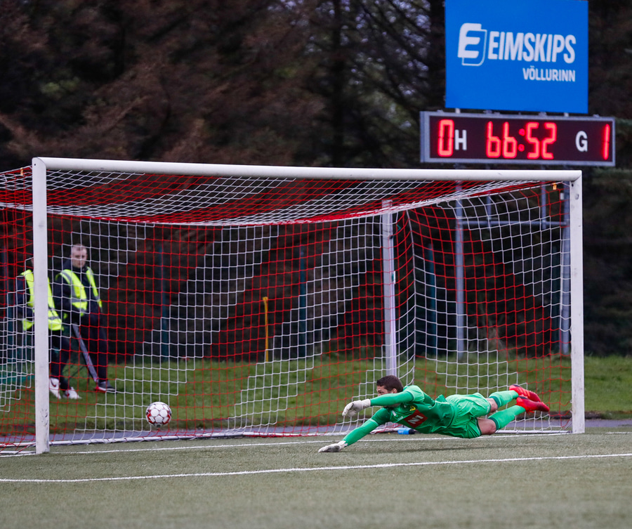 Veit ekki hvort hann sé skyldur Íþróttaálfinum en Sindri Scheving skokkar fimlega til þess að taka spyrnuna. Það myndast mikil hætta við spyrnuna en hún flýgur samt í gegnum allan pakkan.