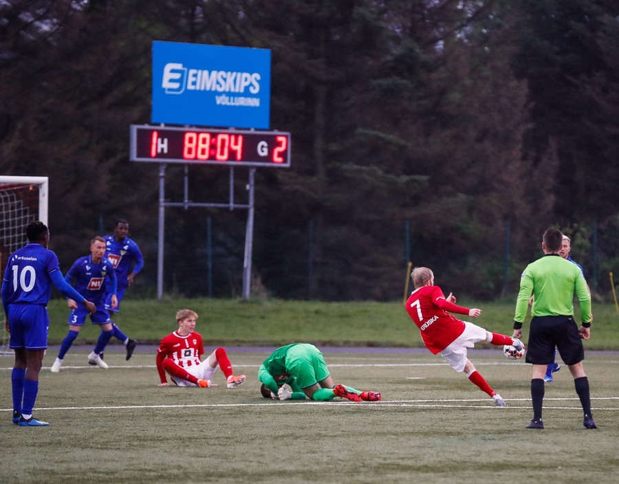ÁGÚST LEÓÓÓ!! Þú verður að hitta þennan bolta betur vinur minn! Frábær bolti frá Aroni Þórði inn á boxið sem Keke missir af og Ágúst er einn og óvaldaður en nær bara ekki almennilegum skalla! Dauðafæri sem hann átti að nýta betur.