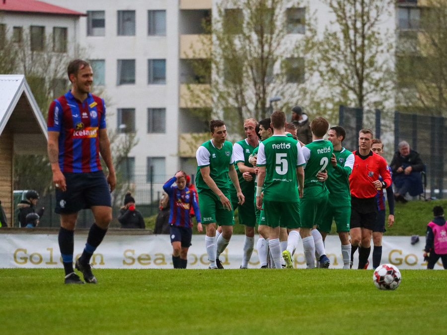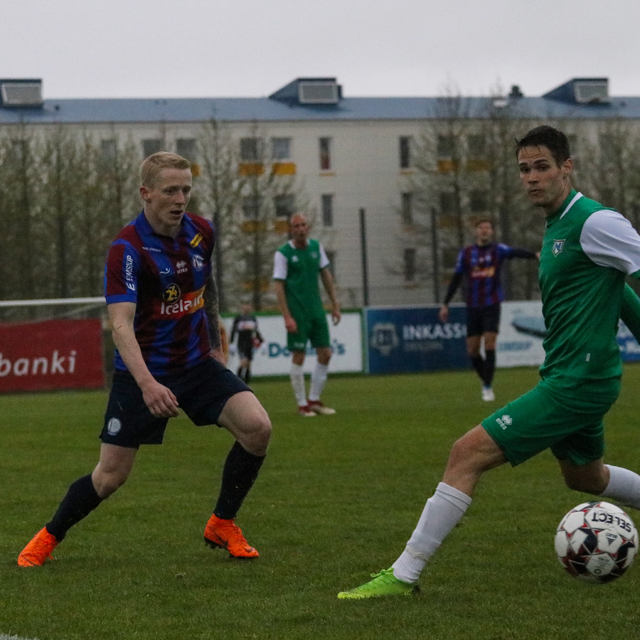 Leiknir úr Reykjavík og Njarðvík etja hér kappi á blautum og iðagrænum Leiknisvellinum (Ghetto Ground).