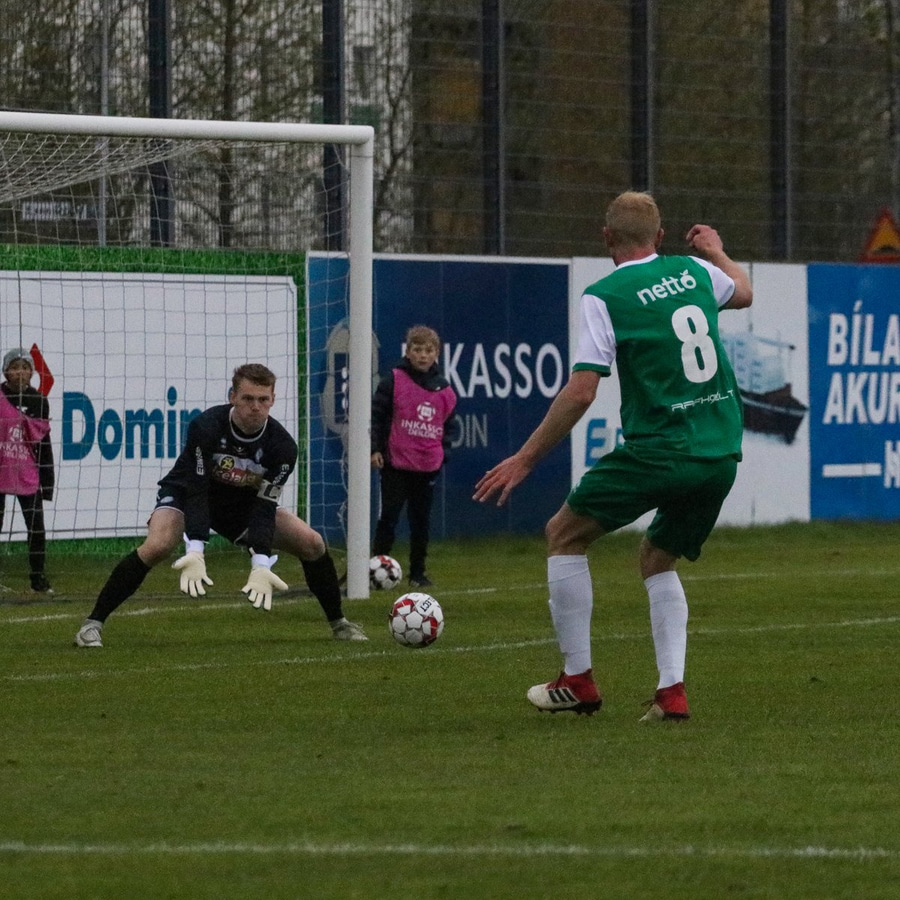 Fá svo vítið upp úr hornspyrnu þegar Sævar tekur snertingu í bakið og fellur við.