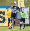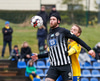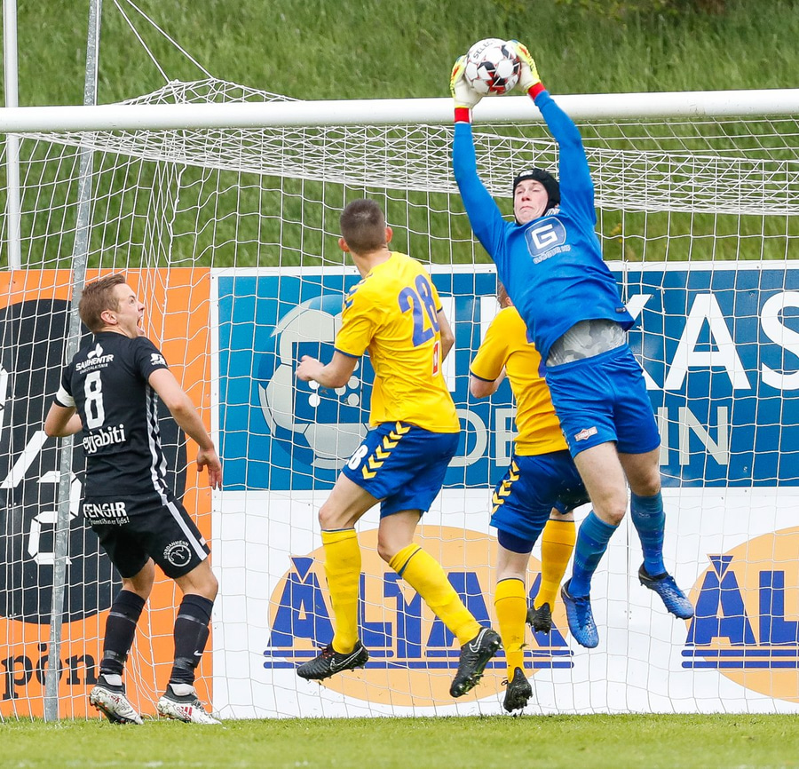 Boltinn kemur frá hægri til Gumma Kalla fyrir framan teiginn sem tekur skotið með vinstri, Aron Elí ver en Albert Brynjar nær frákastinu en aftur ver Aron og boltinn fer í Albert og afturfyrir.
