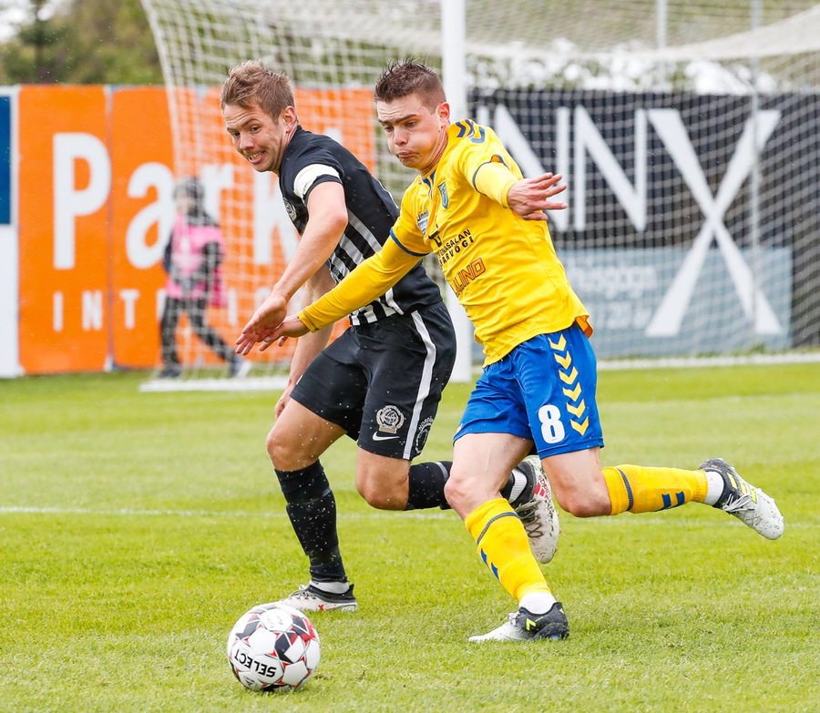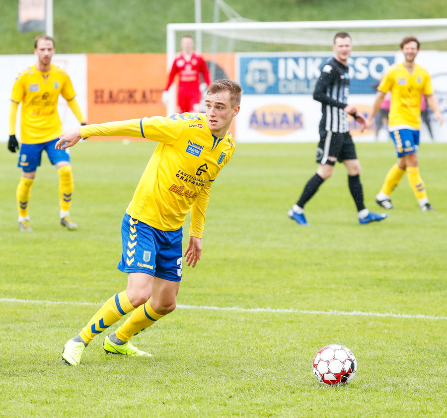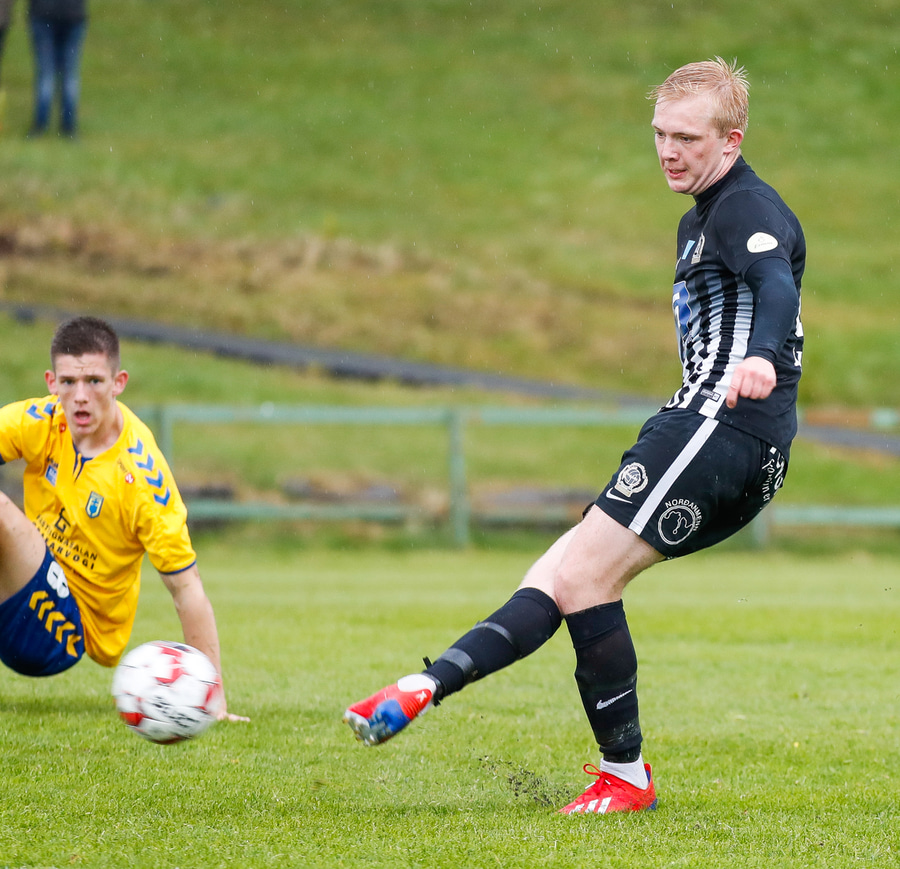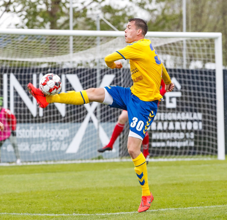 Arnór Breki með geggjaðan bolta inn á teiginn og Ström hefur hreinlega of mikinn tíma á boltanum þannig hann tekur móttöku og bíður og bíður þangað til að hann tekur skotið í varnarmann.