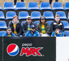 Liðin eru að hita upp, varamenn úlpuklæddir að leika sér. Það er svolítill kuldi í þessu í dag.