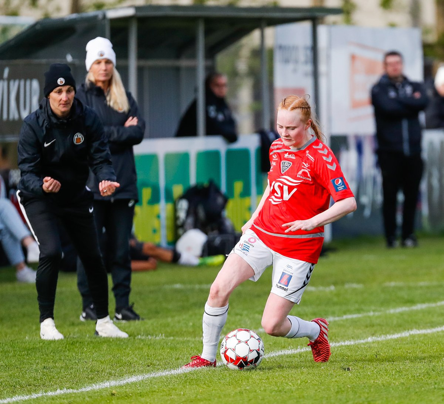 Kr-ingar byrja á fínni sókn sem endar með að Guðmunda Brynja fær boltann inn í teig en nær ekki að koma honum á markið.