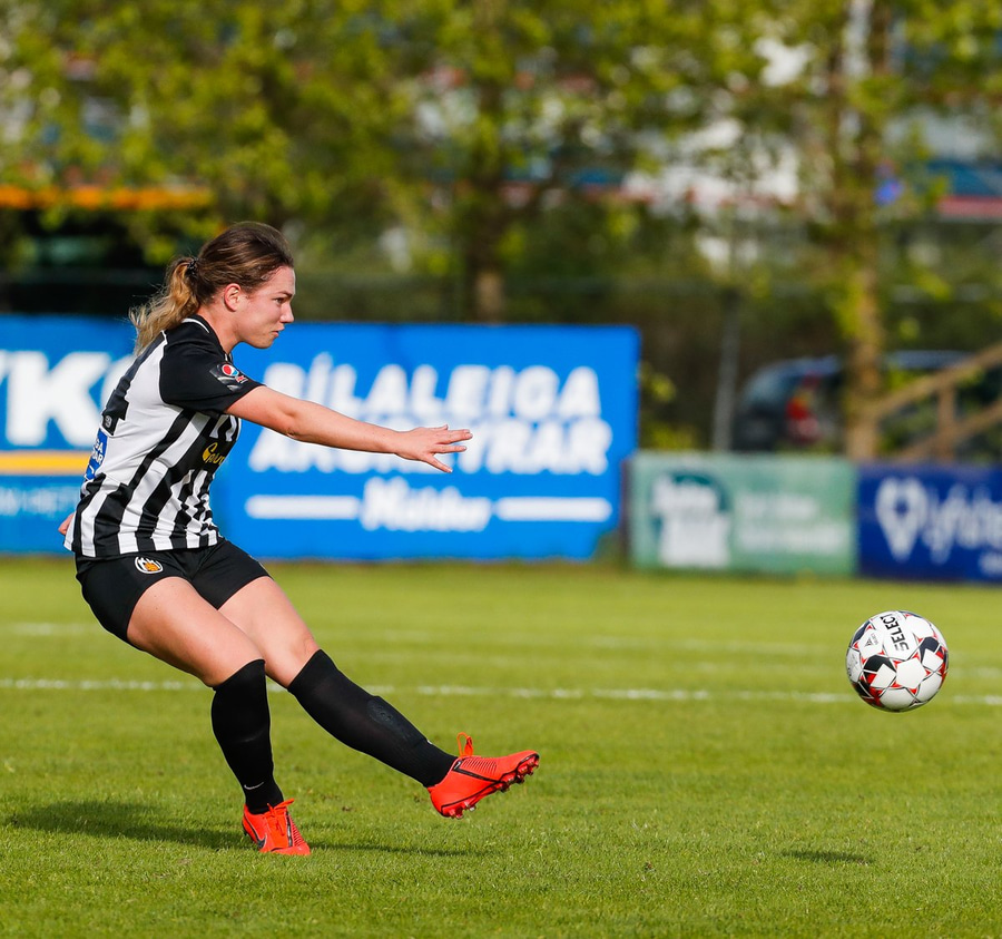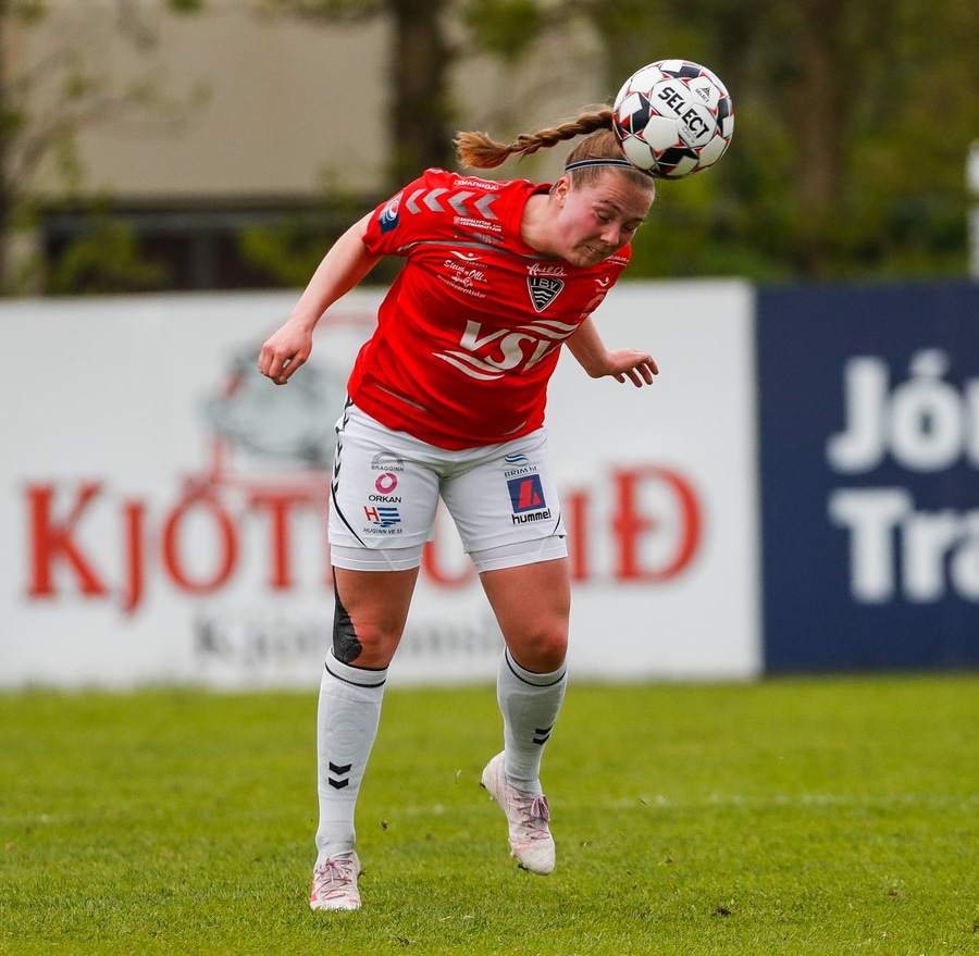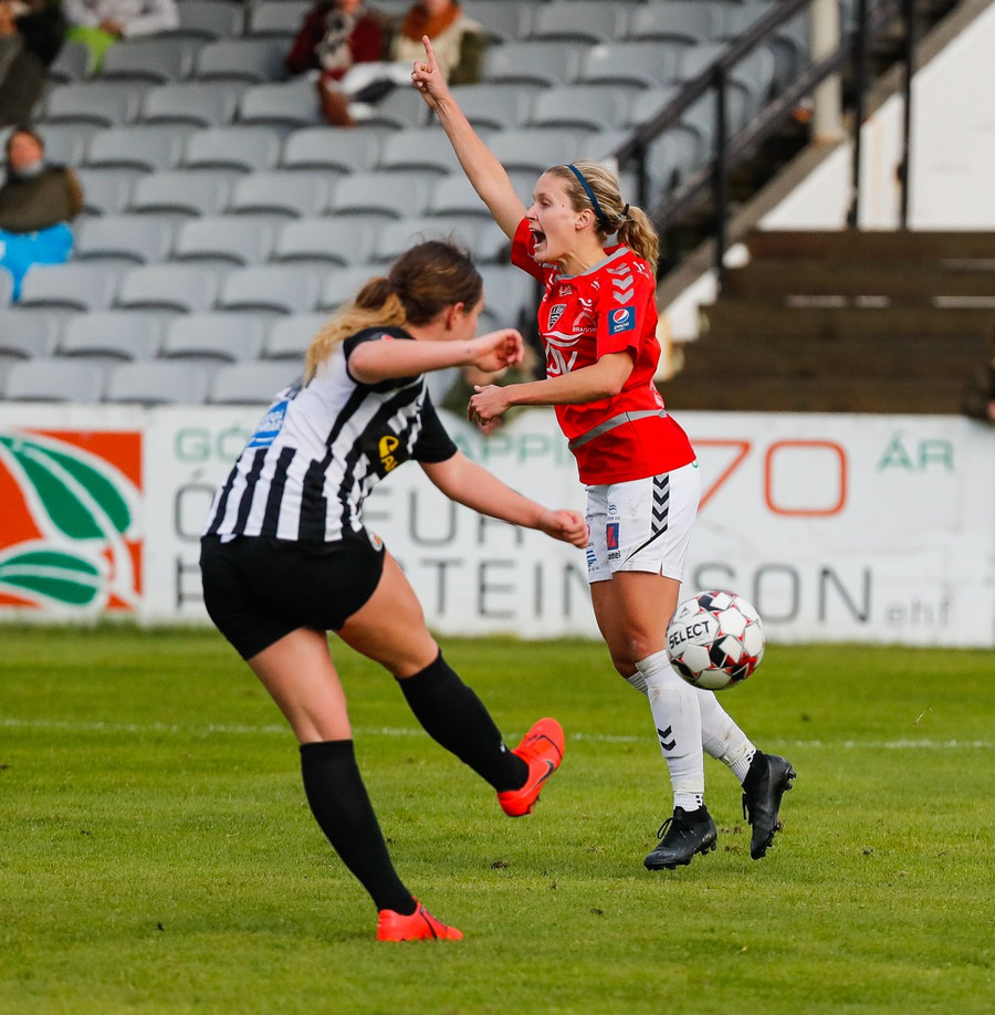 Guðrún Bára með flotta fyrirgjöf sem Cloé skallar í netið.