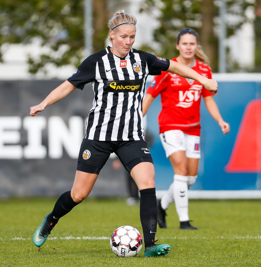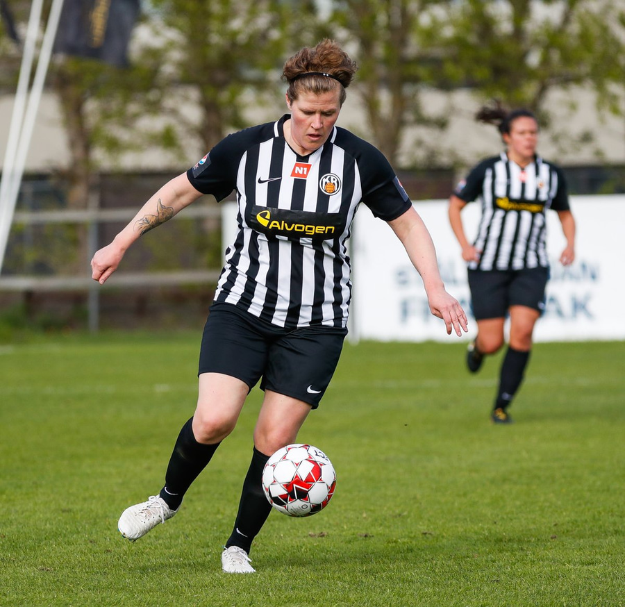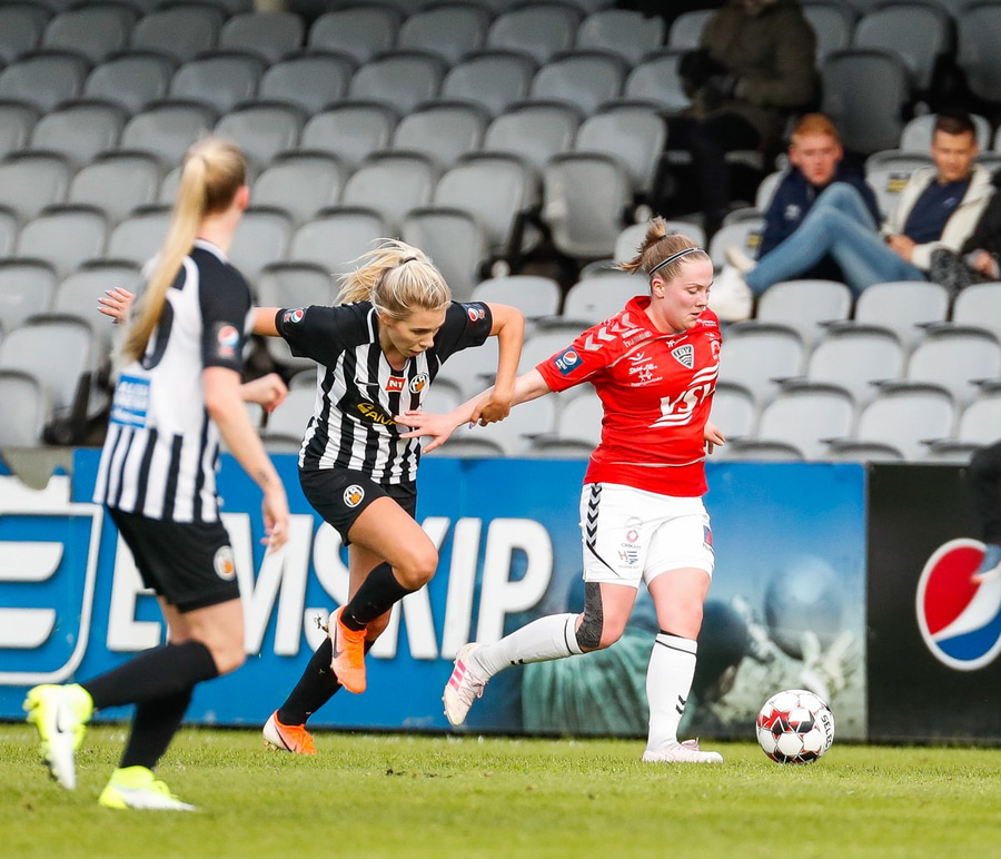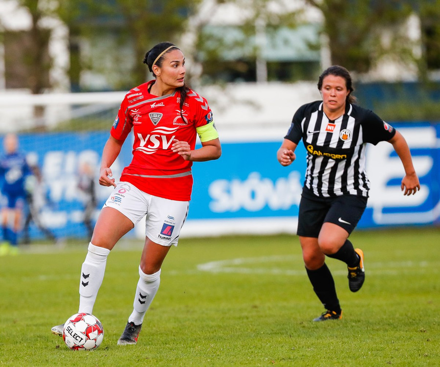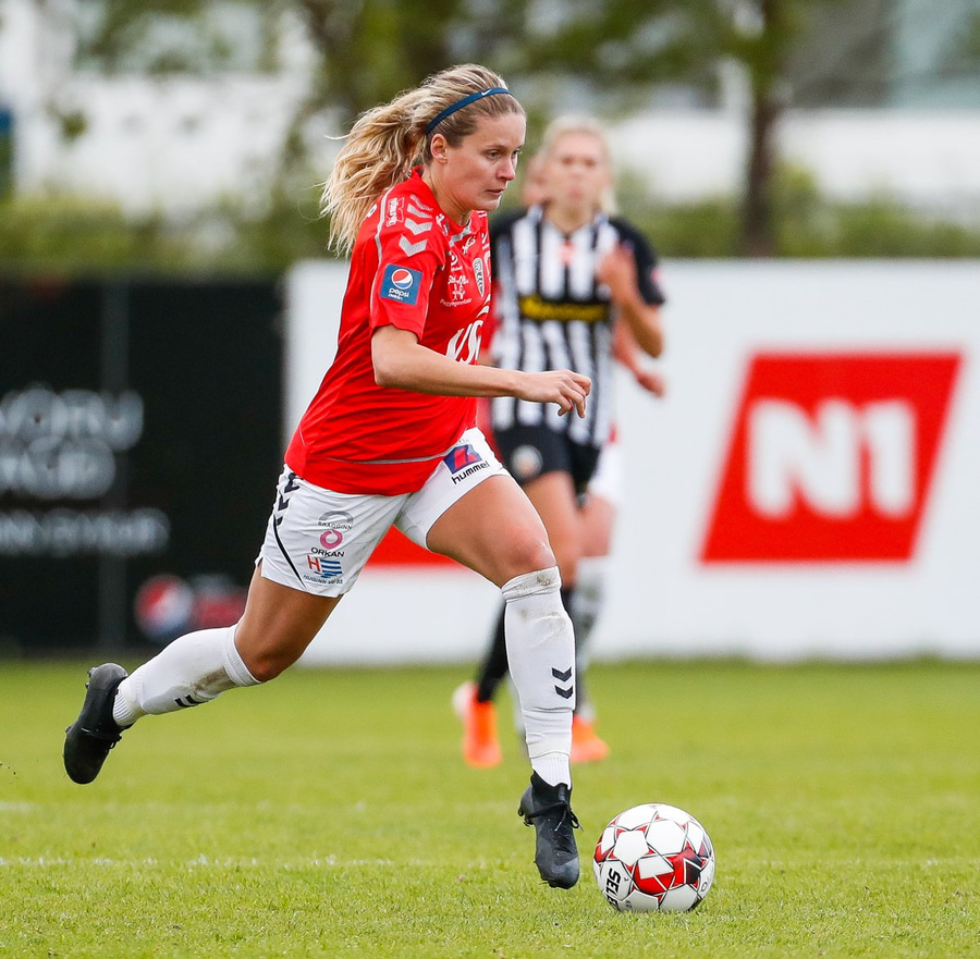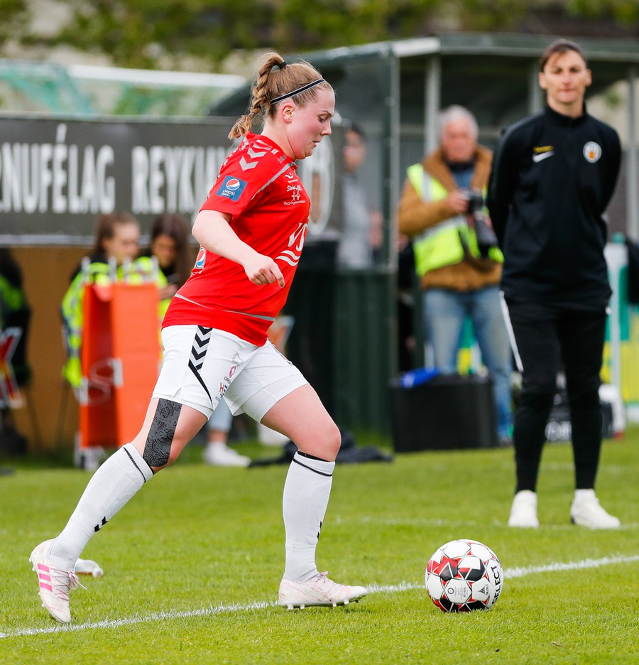 Brýtur á Ásdísi á miðjum vellinum.
