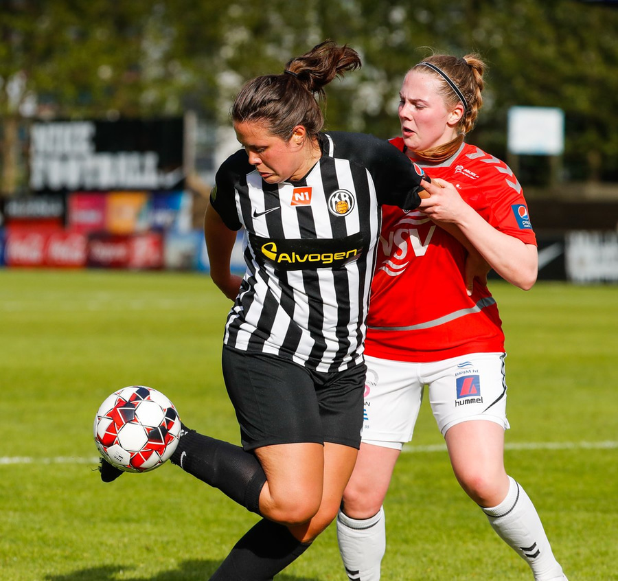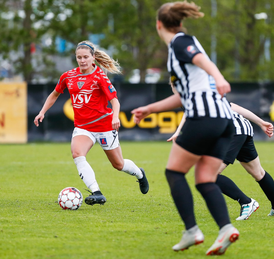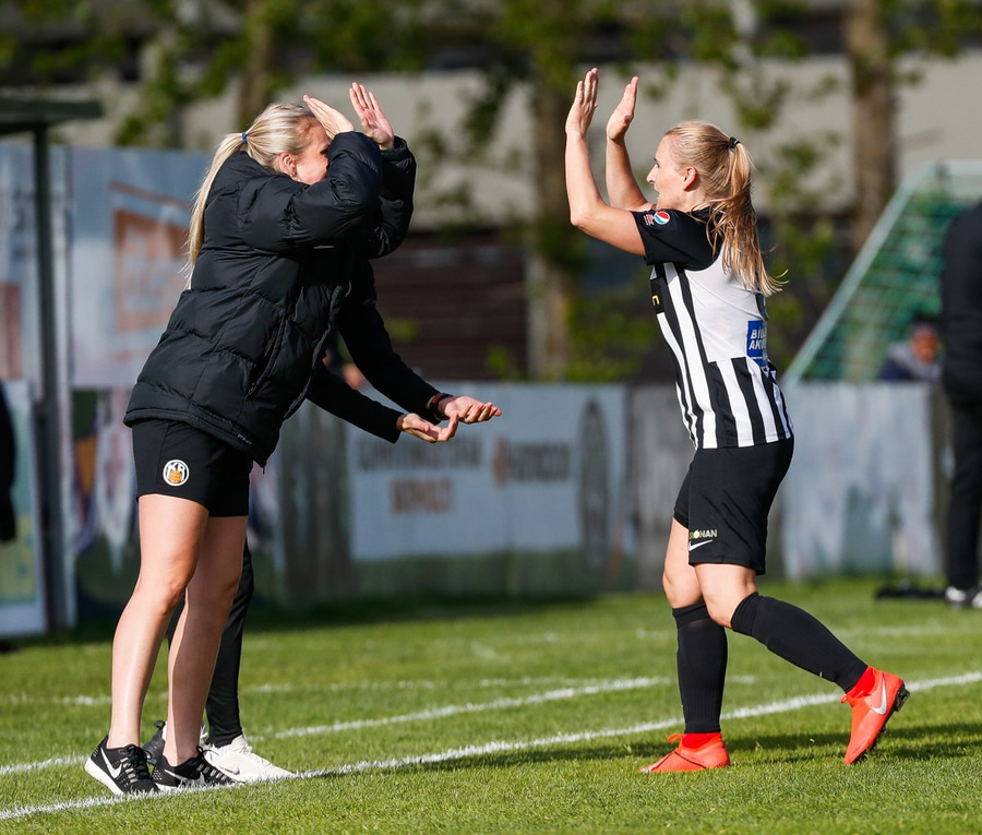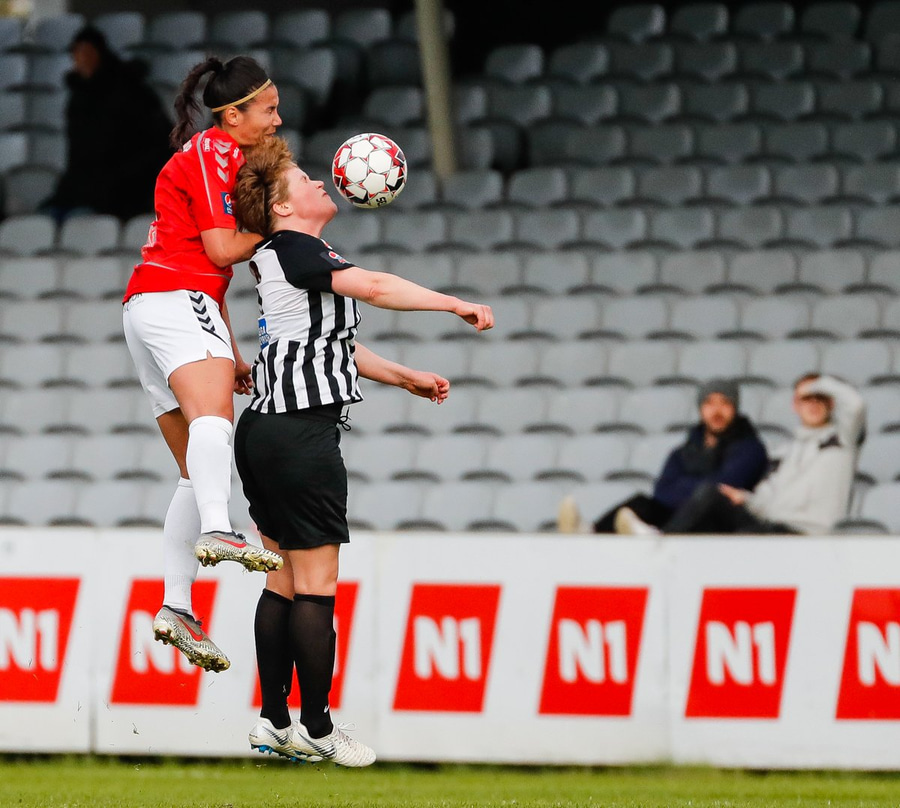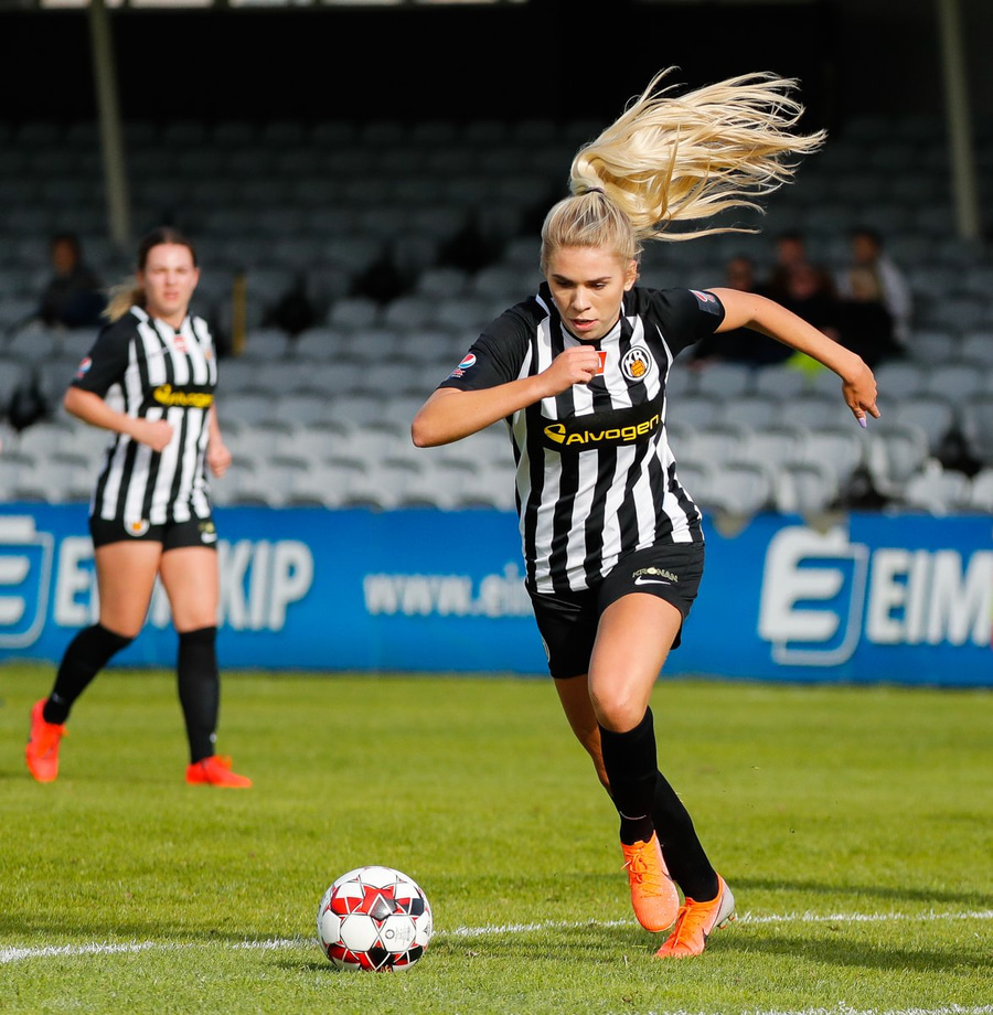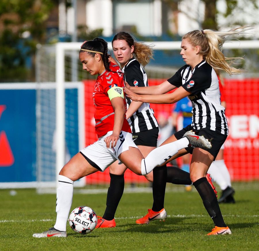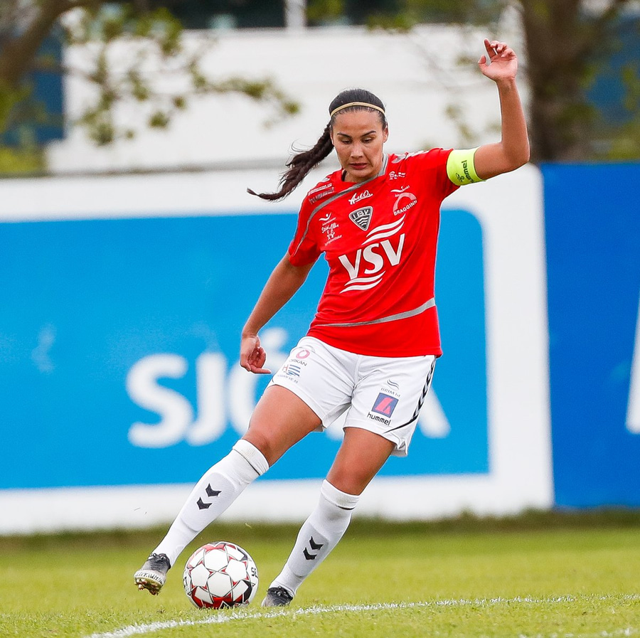Brýtur á Ásdísi á miðjum vellinum.
