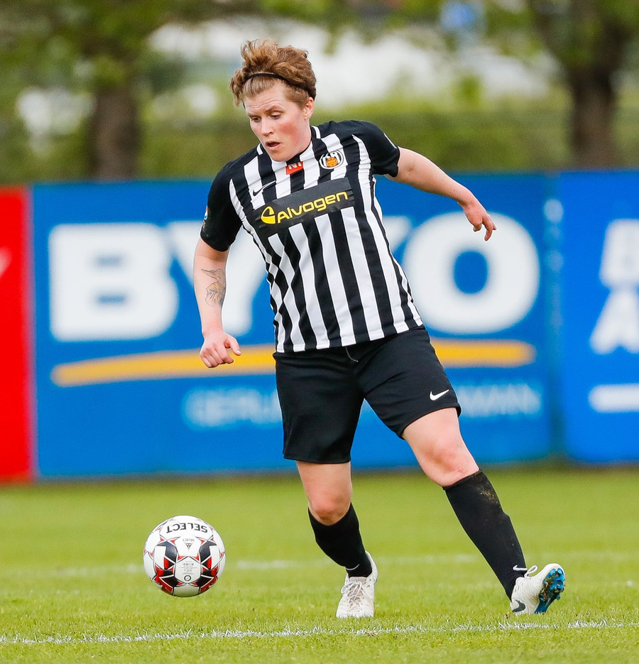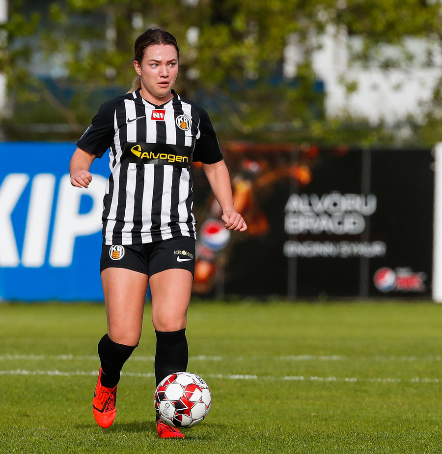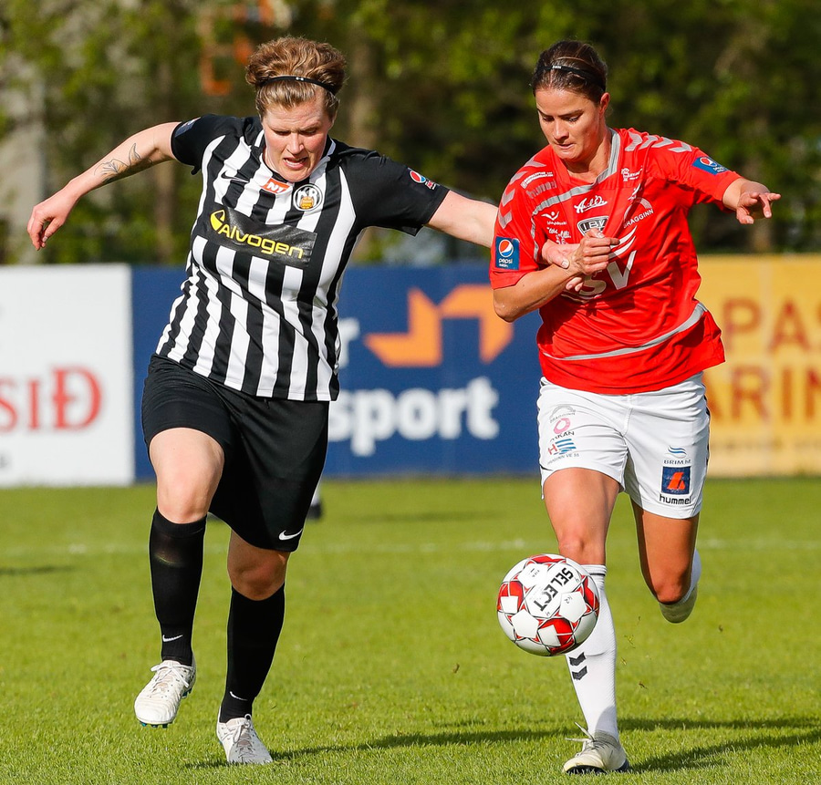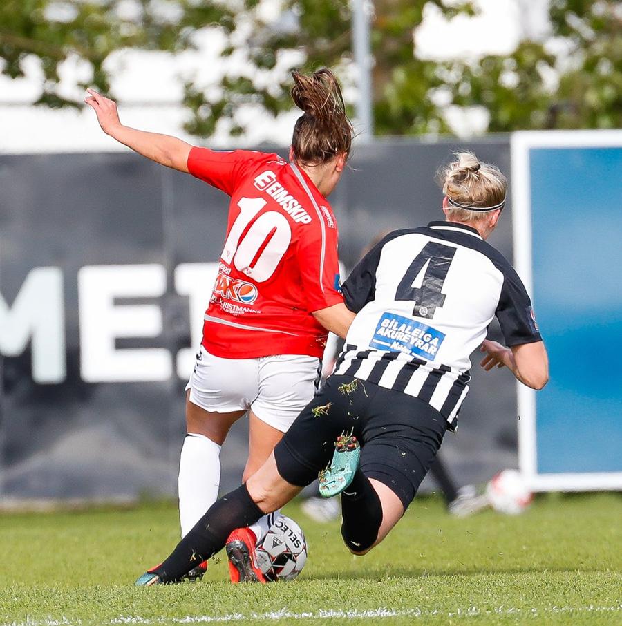 Tekur Kristínu Ernu niður á miðjum vallarhelmingi KR-inga.