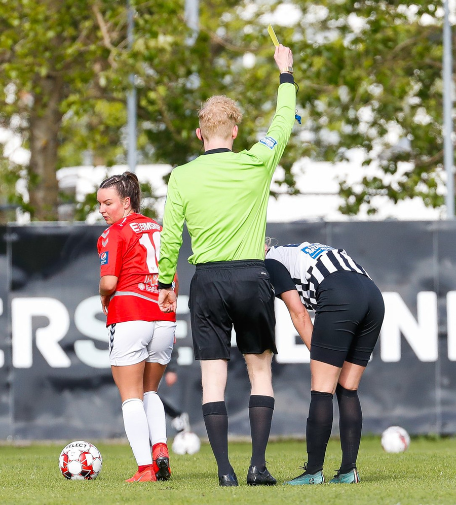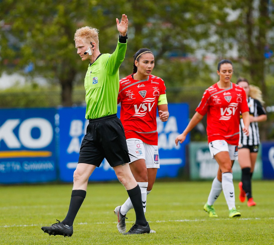 Gult spjald á bekkinn. Leit út eins og Ragna Lóa væri að fá þetta spjald fyrir mótmæli en Bojana fékk spjaldið. Vildu fá aukaspyrnu þegar Gumma og Katrín voru að sleppa í gegn.