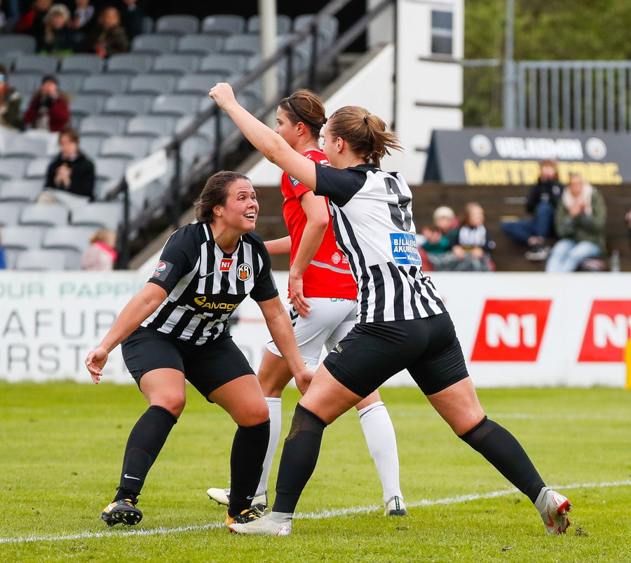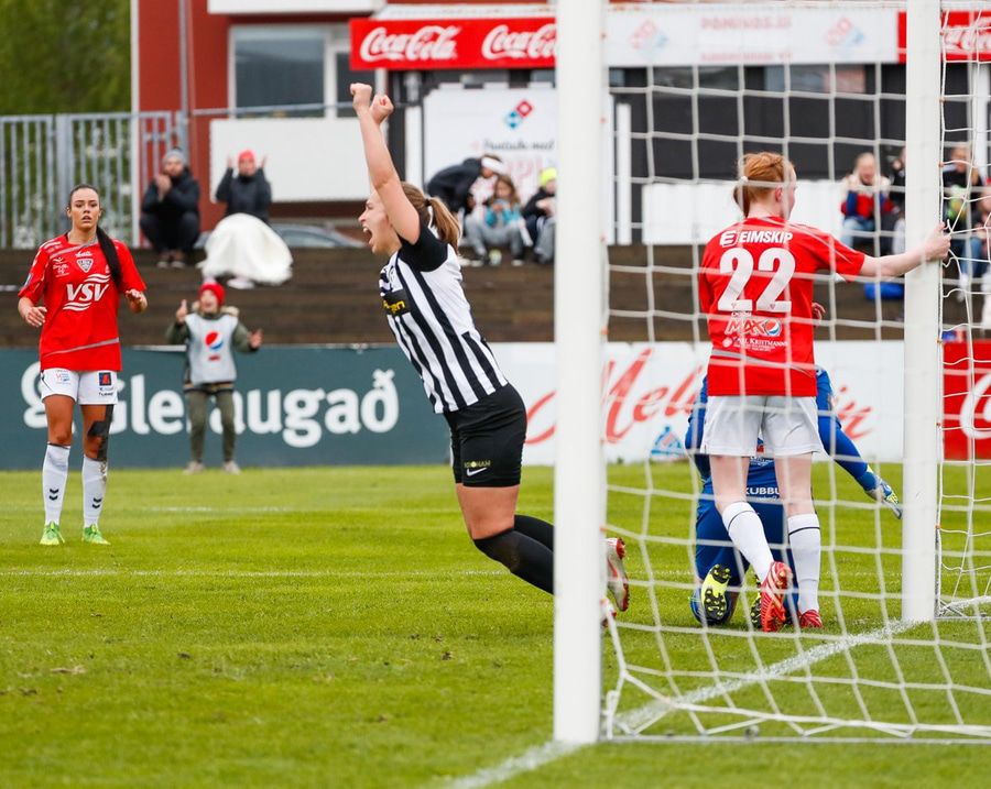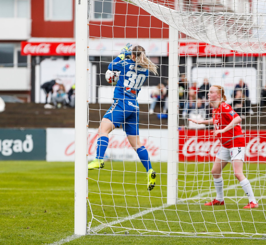 Ásdís með hornspyrnuna beint í hendurnar á Guðný í markinu. Hún nær ekki að taki á boltanum, missir hann frá sér og Ingunn rétt kona á réttum stað og setur hann yfir línuna.