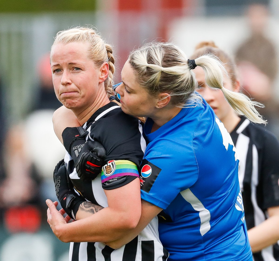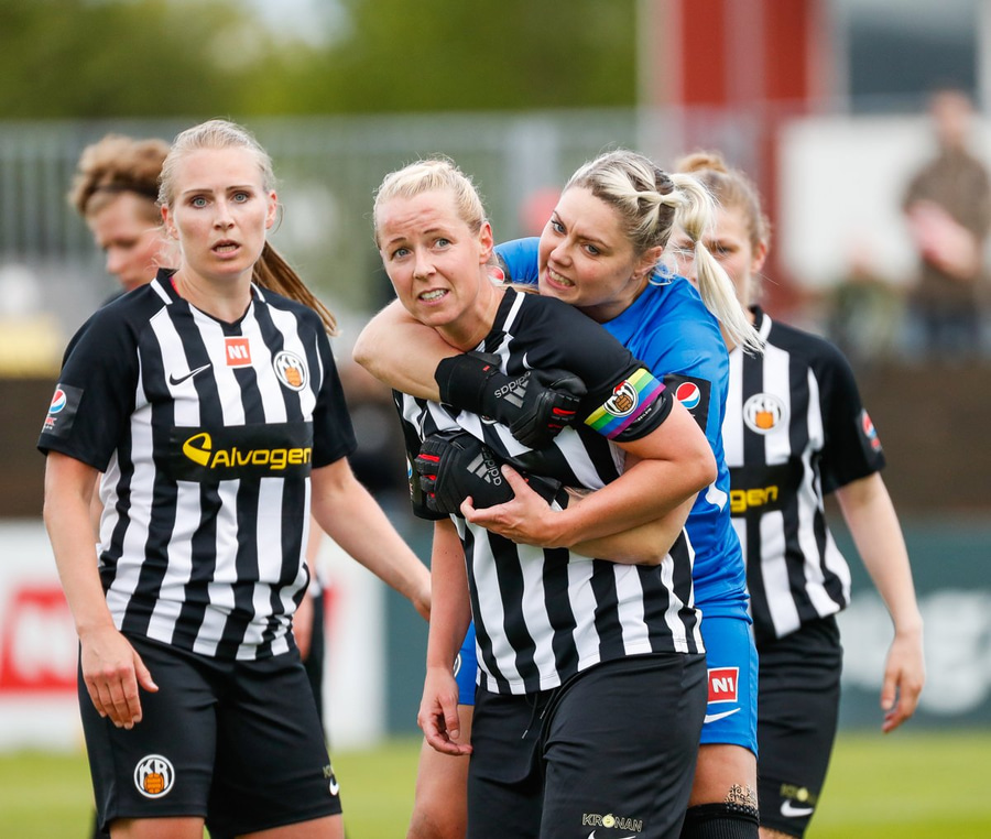 Emma liggur eftir. Virðist hafa misstigið sig þegar hún reynir að halda boltanum inn á vellinum. Vonum að þetta sé ekki alvarlegt.