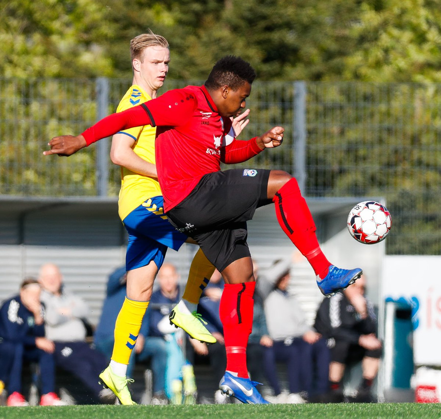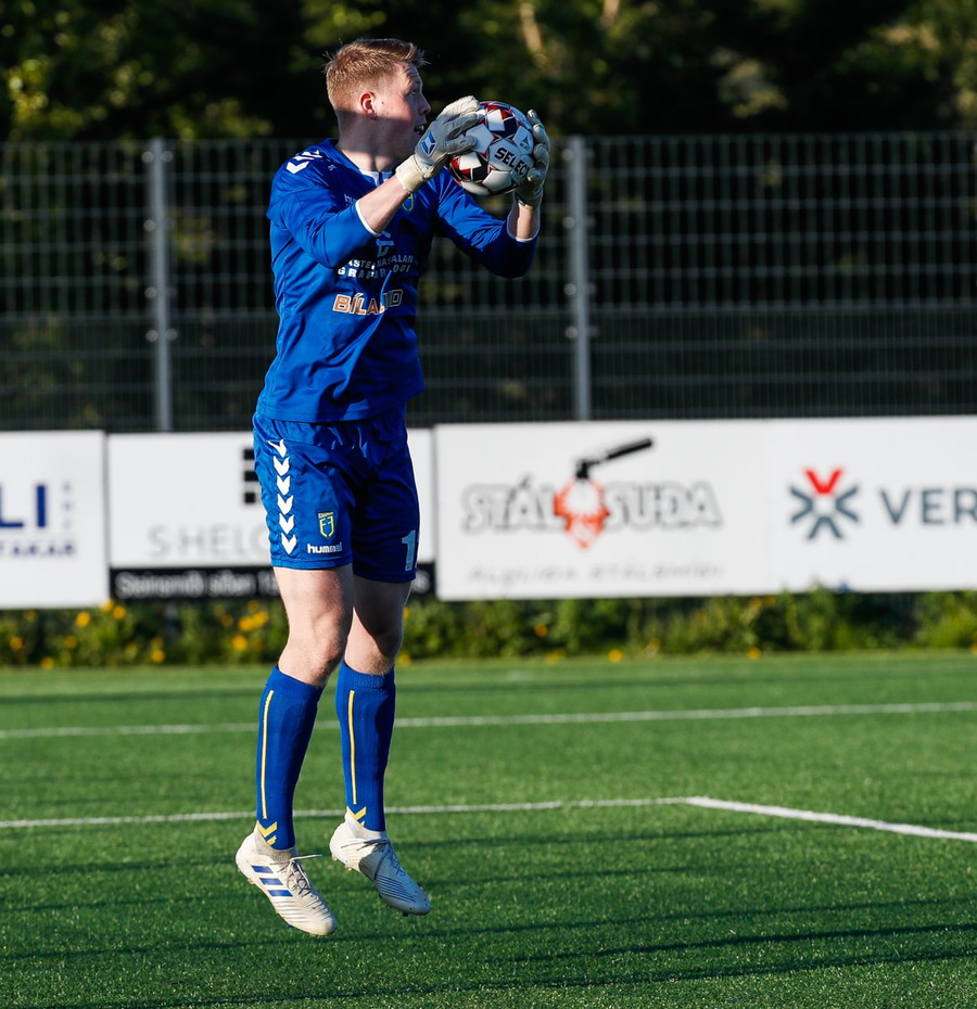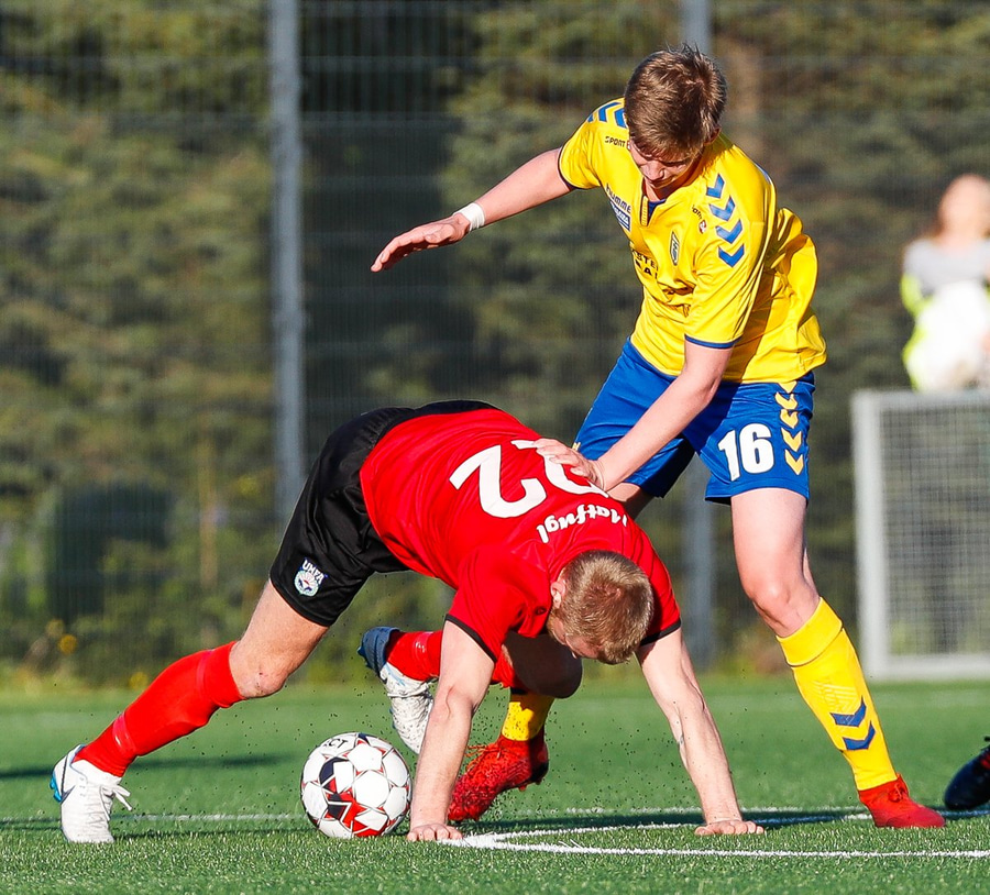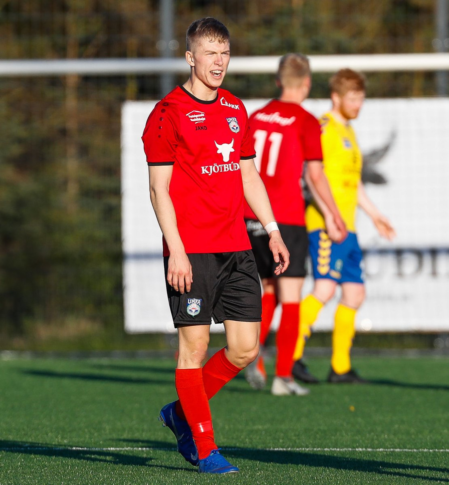 Kristófer fær hann í gegn frá Alberti og er í mjög þröngu færi. Setur hann beint á Trausta og boltinn lekur inn. Trausti hefði eflaust viljað gera betur þarna.