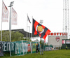 Liðin mætt út á völl í upphitun og KR útvarpið mætt mér við hlið. Fólk að mæta í stúkuna og sólin að skína. Fullkomið.
