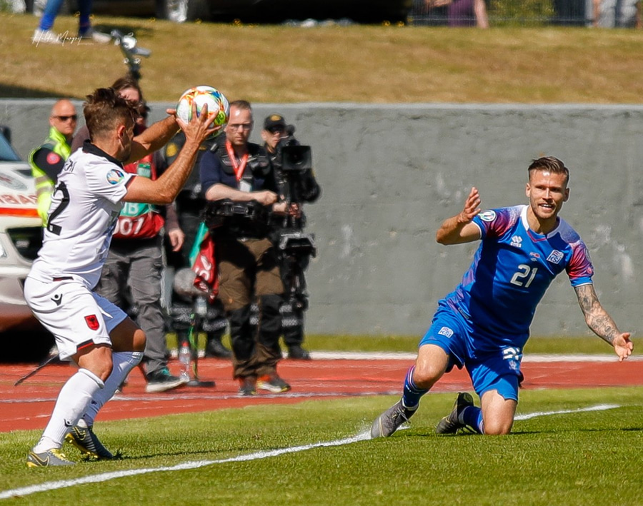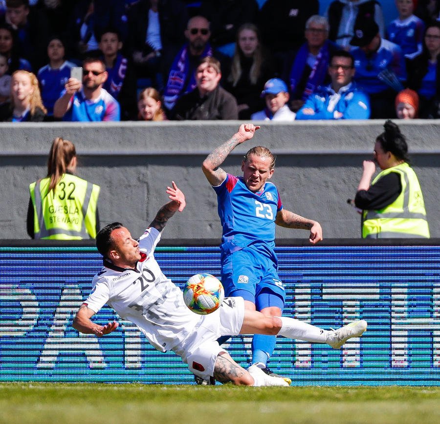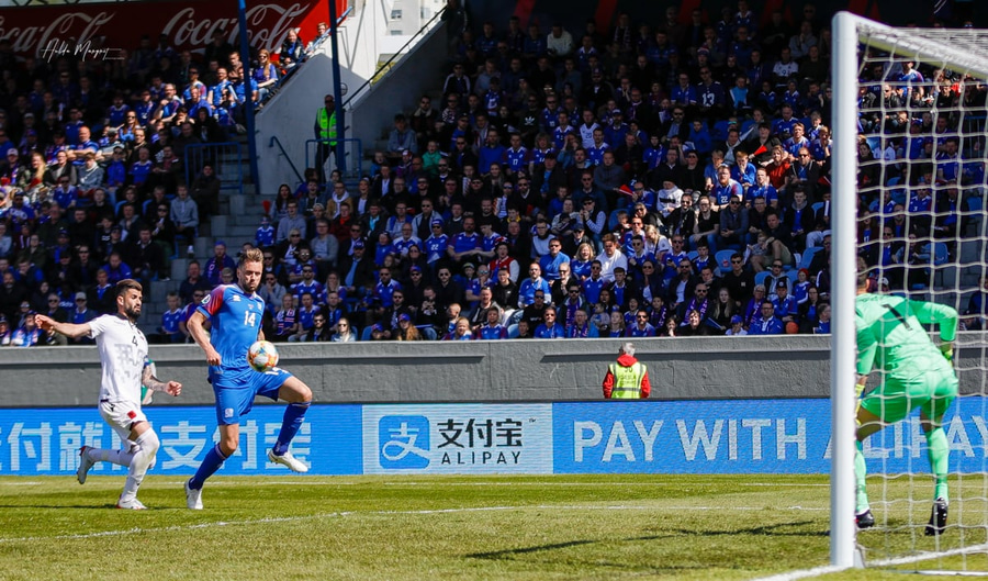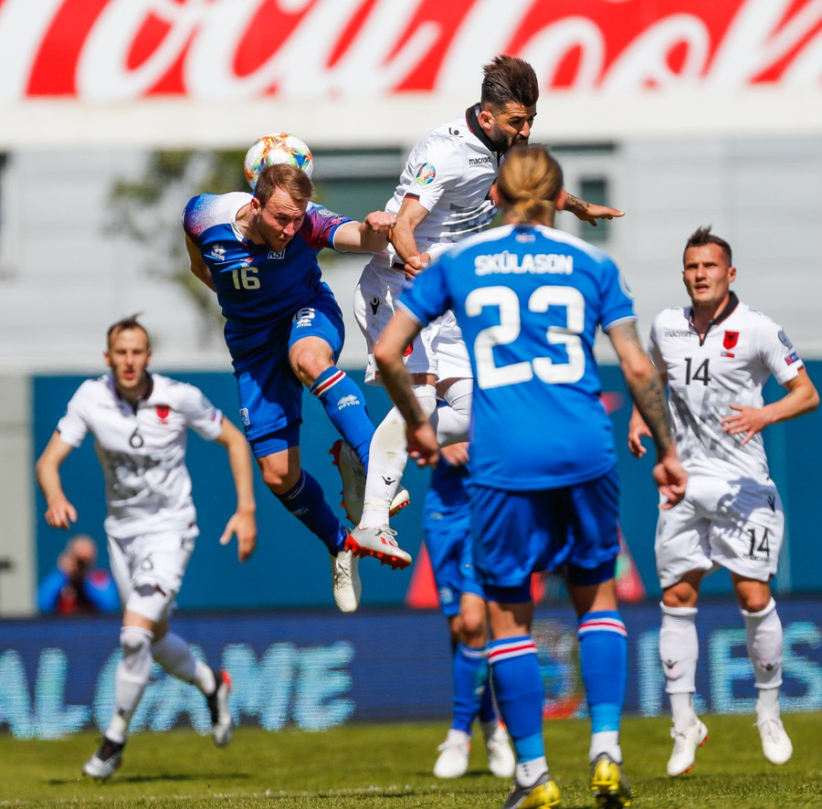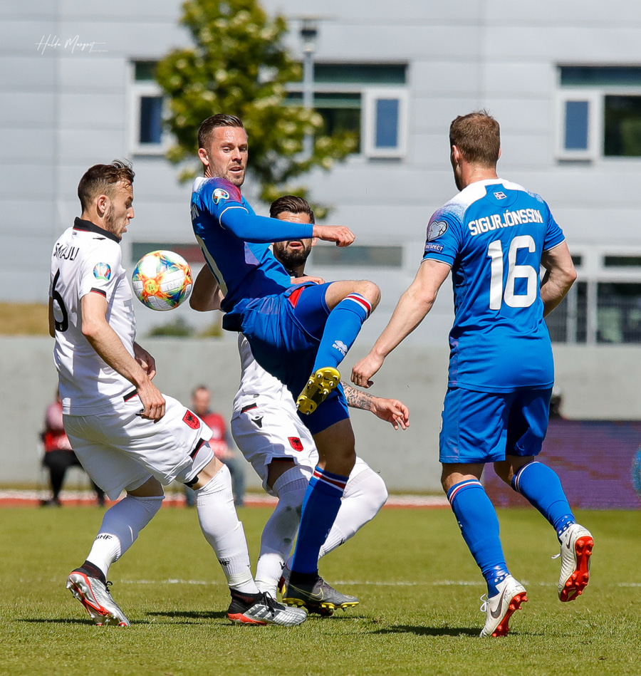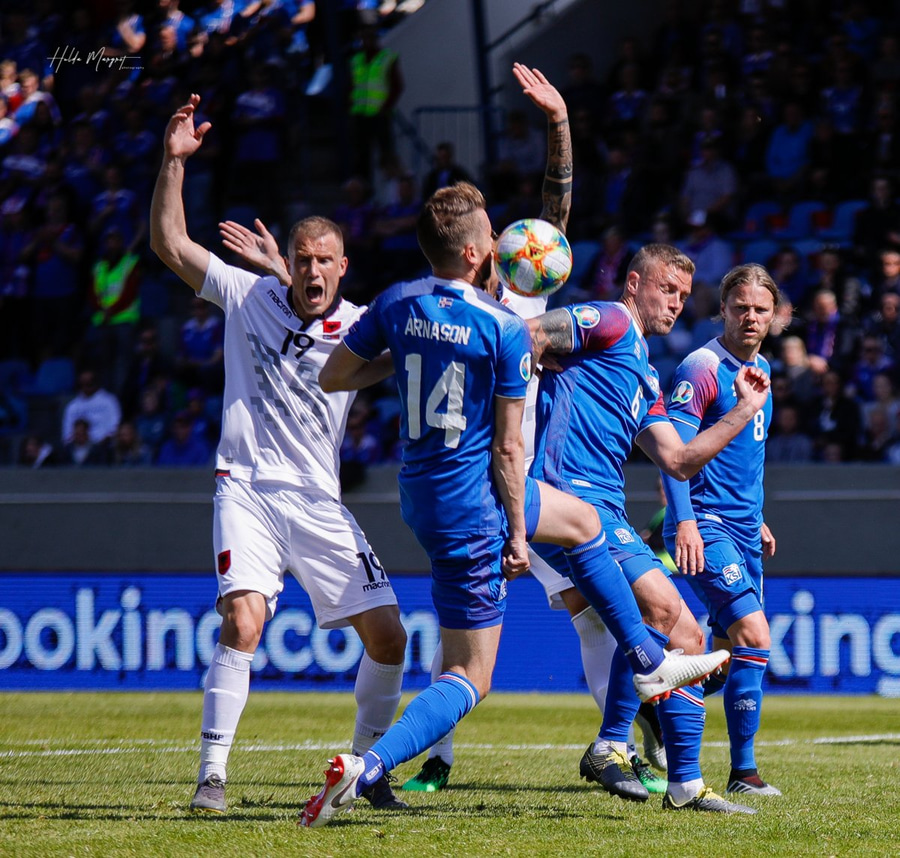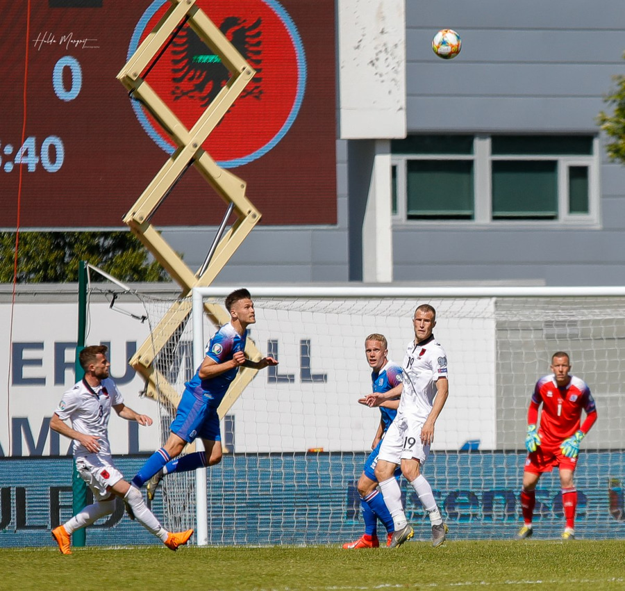 Jóhann Berg ætlar að hreinsa burtu hornið hjólhestaspyrnu og vill það ekki betur en svo að boltinn berst beint á Albana í teignum sem betur fer komast varnarmenn Íslands fyrir boltann.