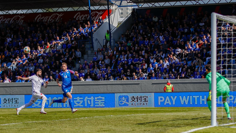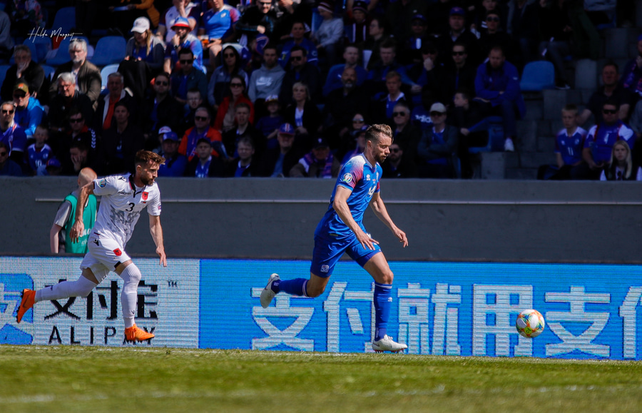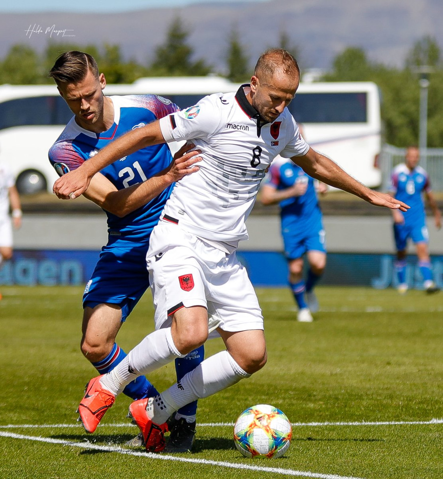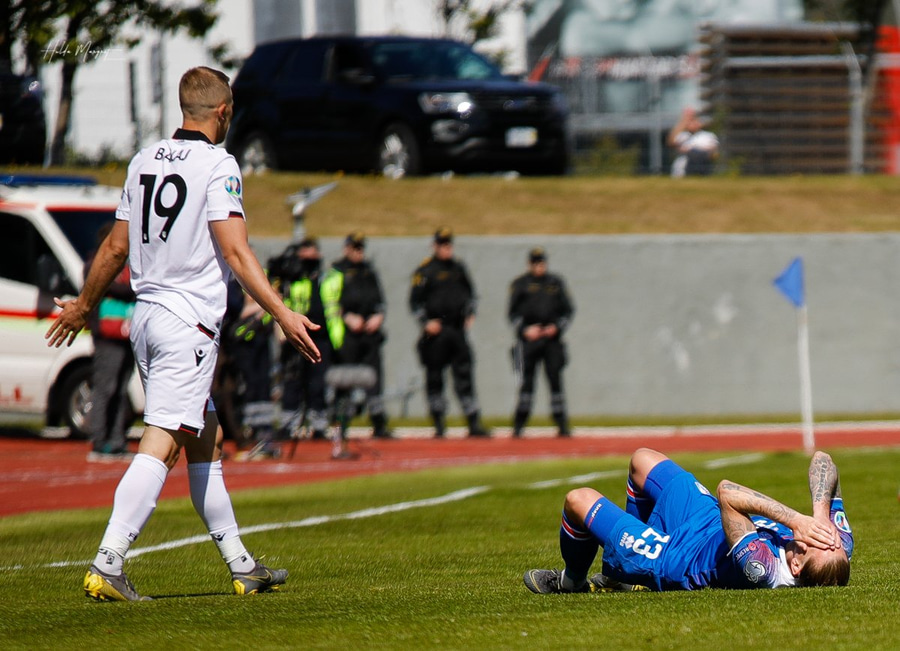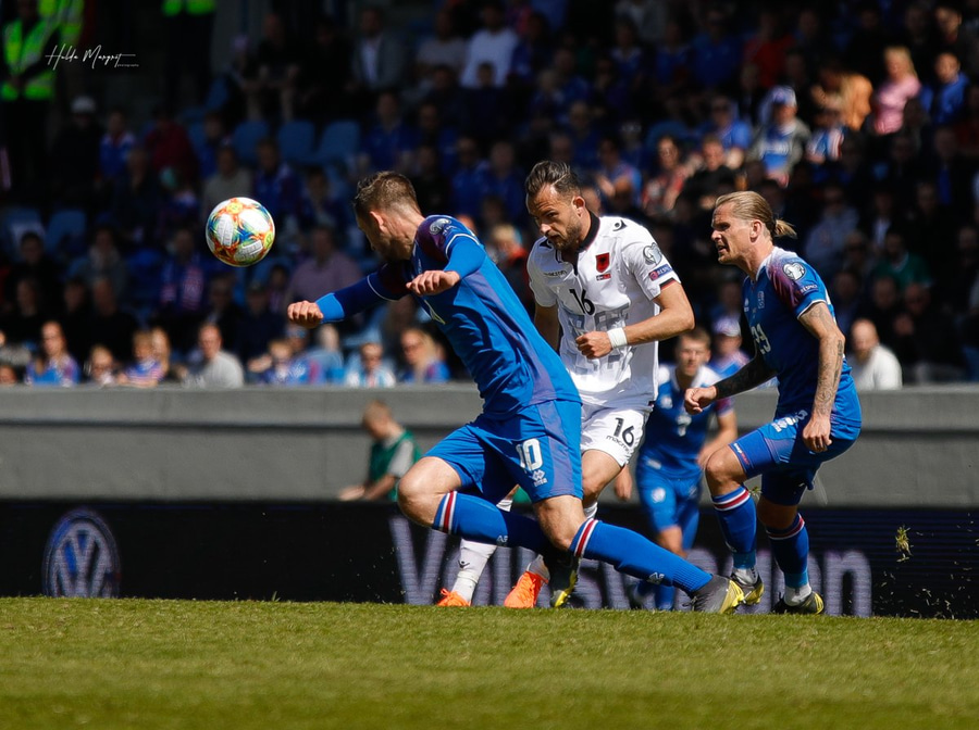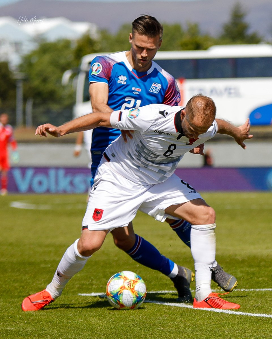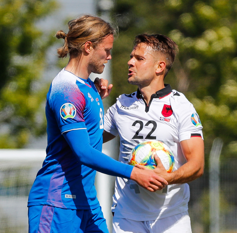 Jóhann Berg ætlar að hreinsa burtu hornið hjólhestaspyrnu og vill það ekki betur en svo að boltinn berst beint á Albana í teignum sem betur fer komast varnarmenn Íslands fyrir boltann.
