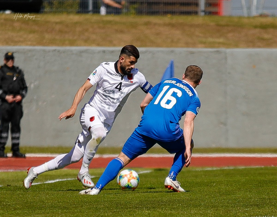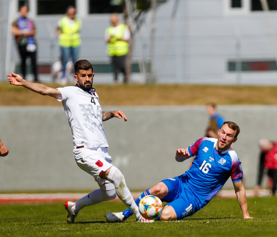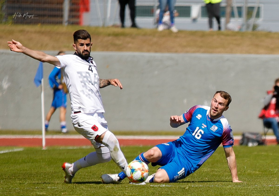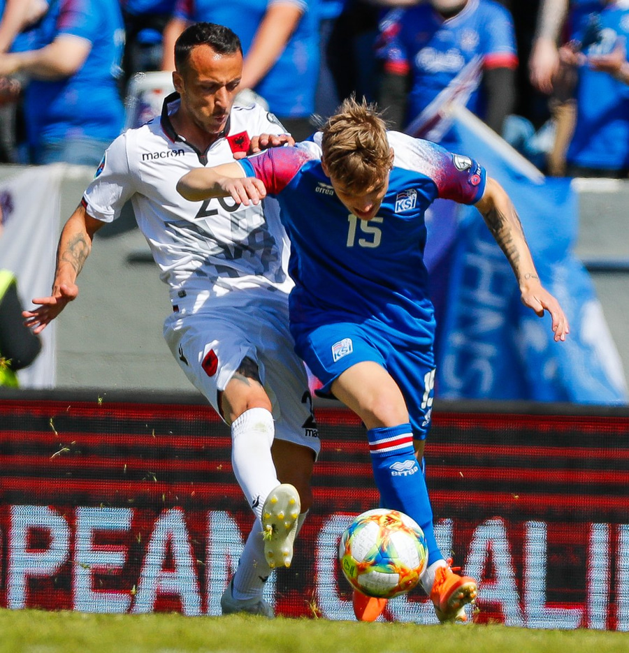 Ermir Lenjani með fasta fyrirgjöf en sem betur fer fyrir Ísland er Kári Árnason á hárréttum stað og kemur boltanum frá.