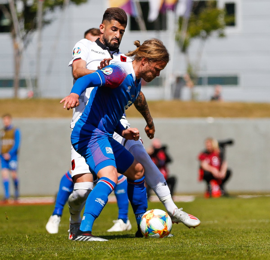 Viðar gerir hér mjög vel gegn þremur Albönum og sendir hann á Rúnar sem að er við það að sleppa í gegn en fyrsta snertingin svíkur hann og sóknin rennur út í sandinn.