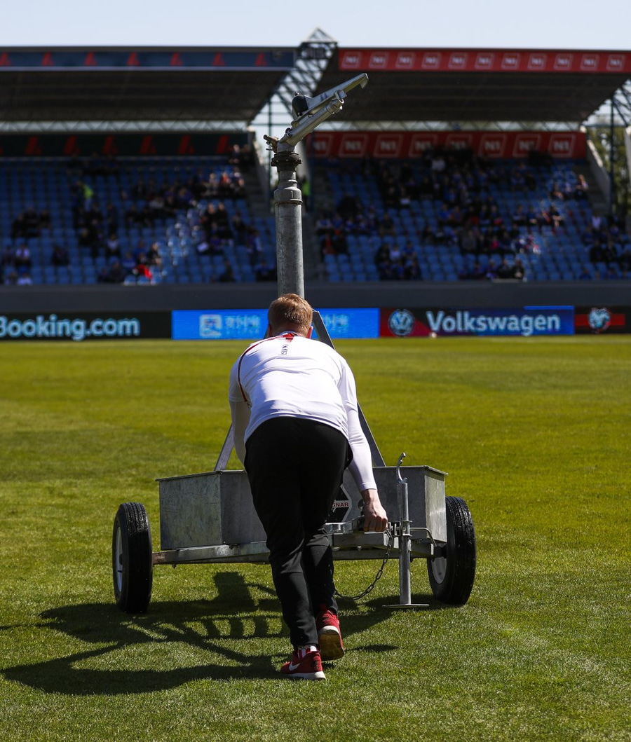 Liðin mætt út á völl að hita upp og einhverjir áhorfendur að dúkka upp í stúkunni. Ég hvet alla sem að hafa ekkert að gera að taka skyndiákvörðun og skella sér á völlinn. Það eru eflaust einhverjir miðar eftir.
