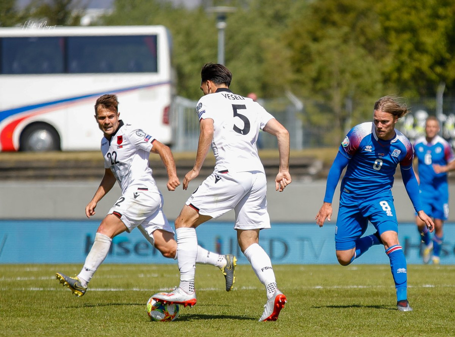 Þetta er bara eins og þegar að frá var horfið. Albanir meira með boltann en íslenska vörnin er þétt.