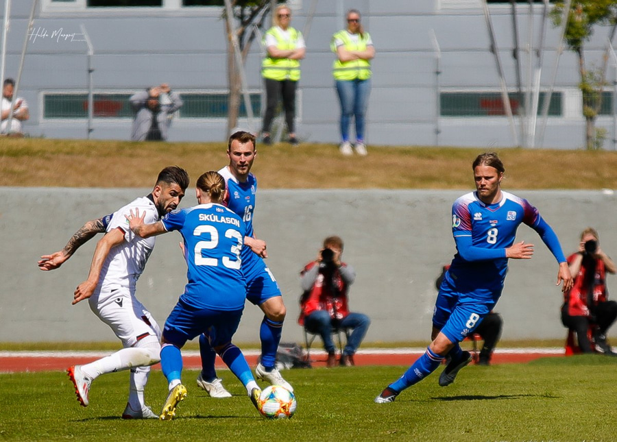 Albanir að dæla hér boltum í teiginn trekk í trekk en alltaf er einhver Íslendingur fyrstur í boltann. Góð vörn hjá strákunum.