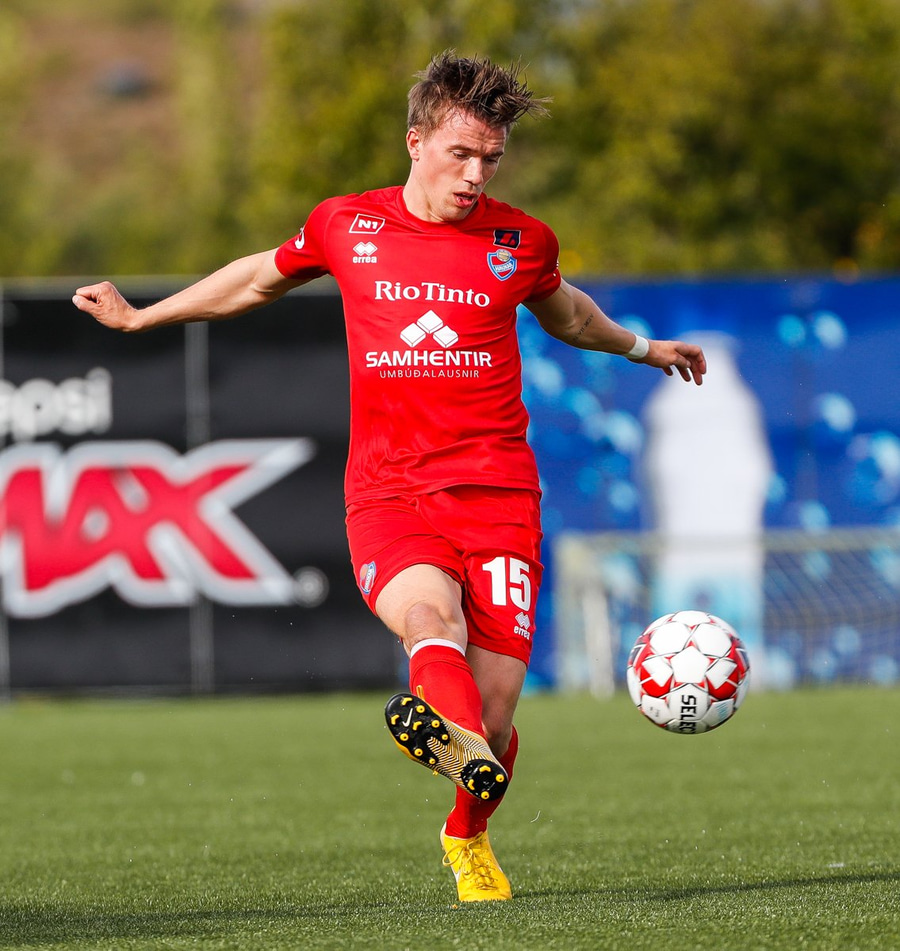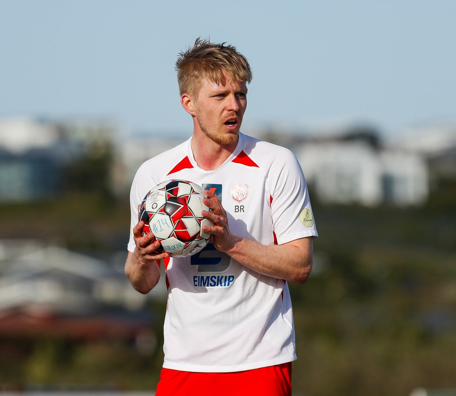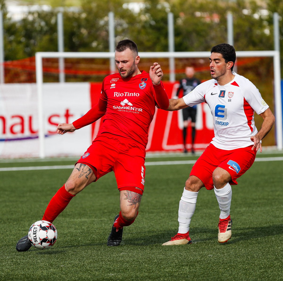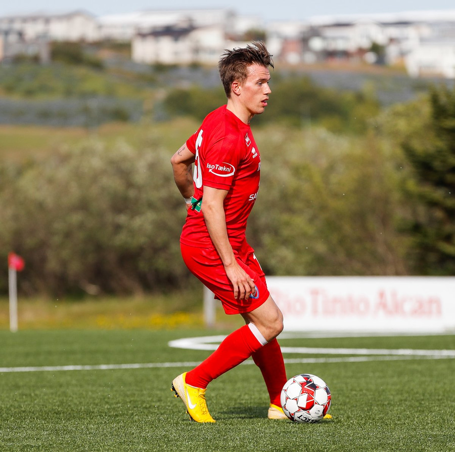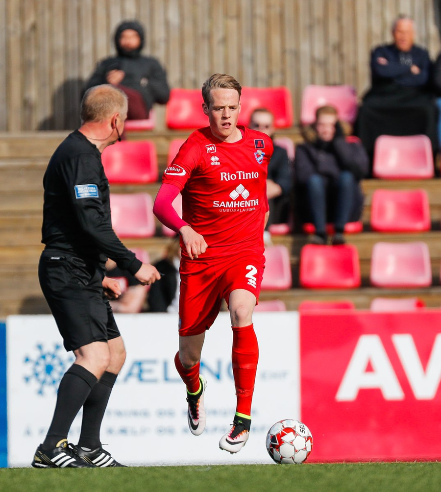Ekki fyrsta grófa brot Hafþórs í leiknum, hárrétt gult spjald þegar hann brýtur á Alvaro á miðjunni þegar Alvaro er á leið í sókn.