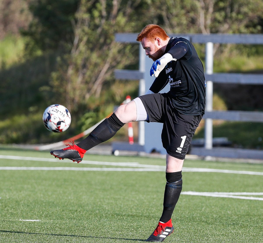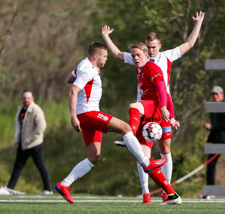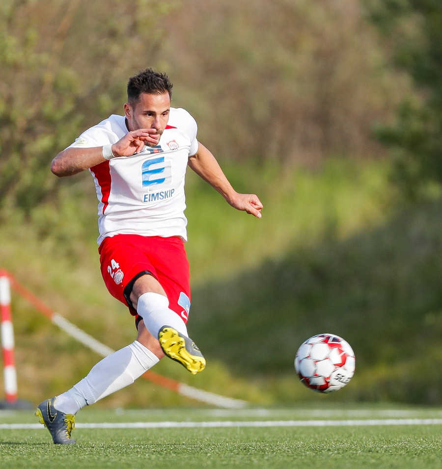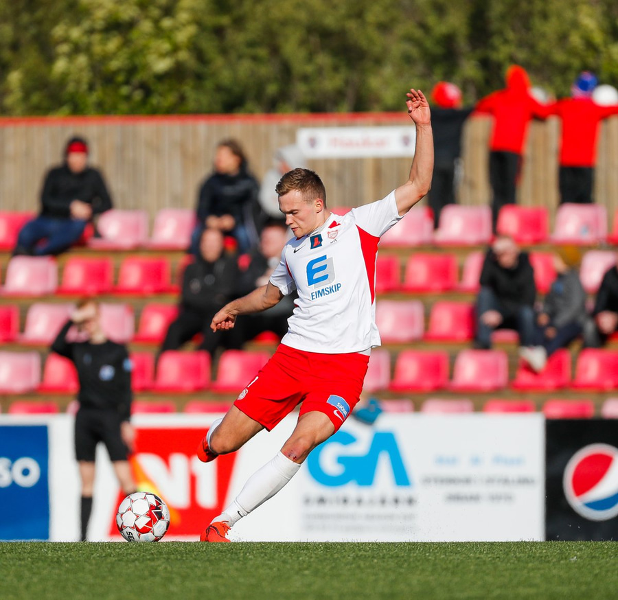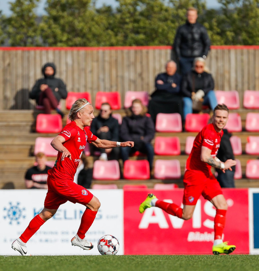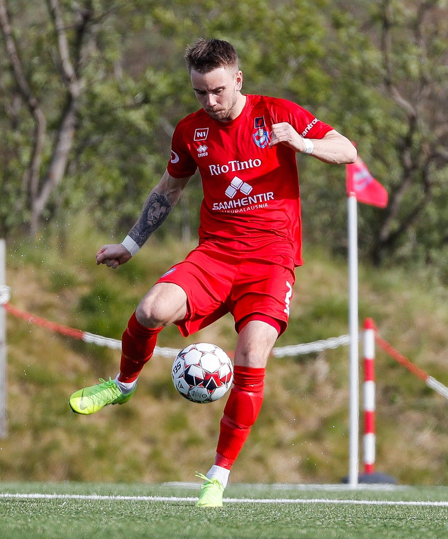 Skot frá Aroni Kristófer upp við endalínu sem endar í innkasti. Flott spil þarna á milli hans og Alvaro sem leiddi til skotsins sem var alltaf ólíklegt til að fara á markið.