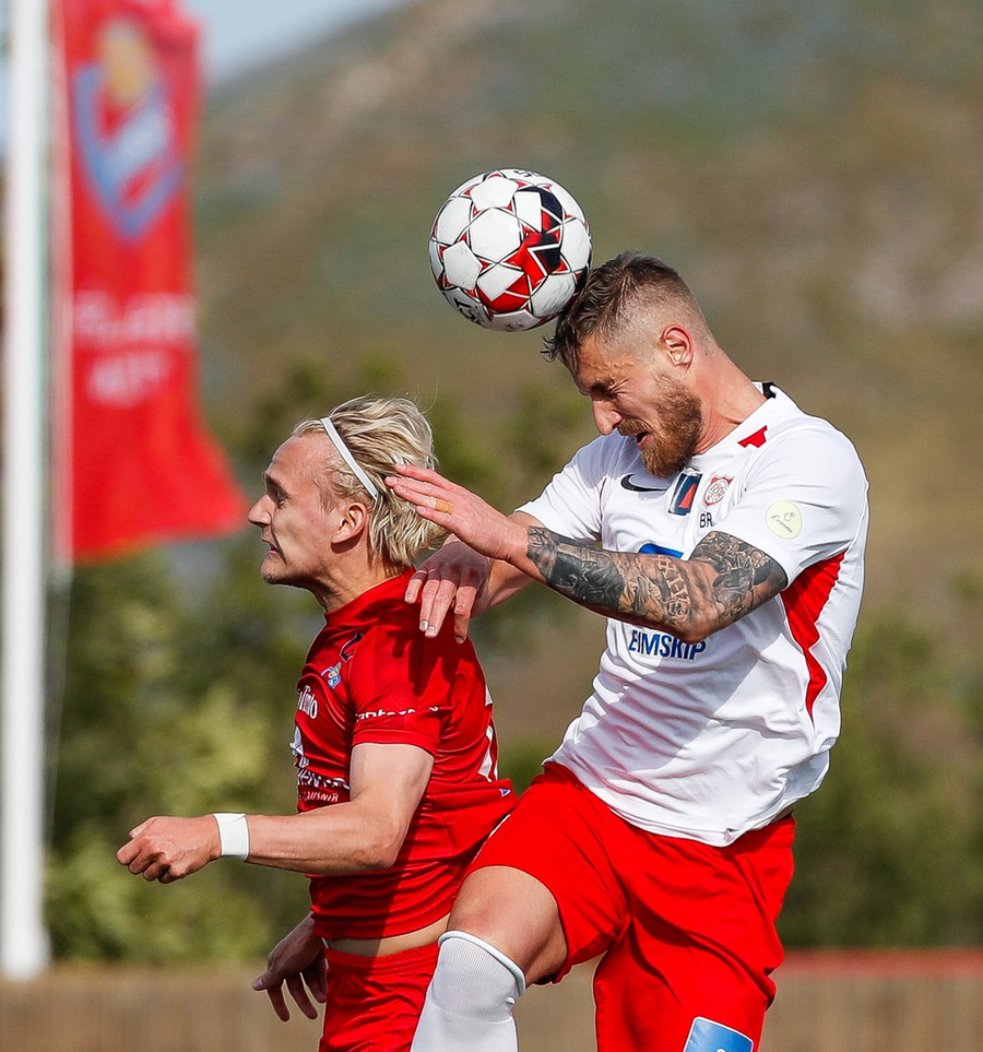 Í ÞESSUM TÖLUÐU ORÐUM! Arnar Aðalgeirs með dúndurskalla í slánna eftir glæsilega fyrirgjöf frá Aroni Frey.