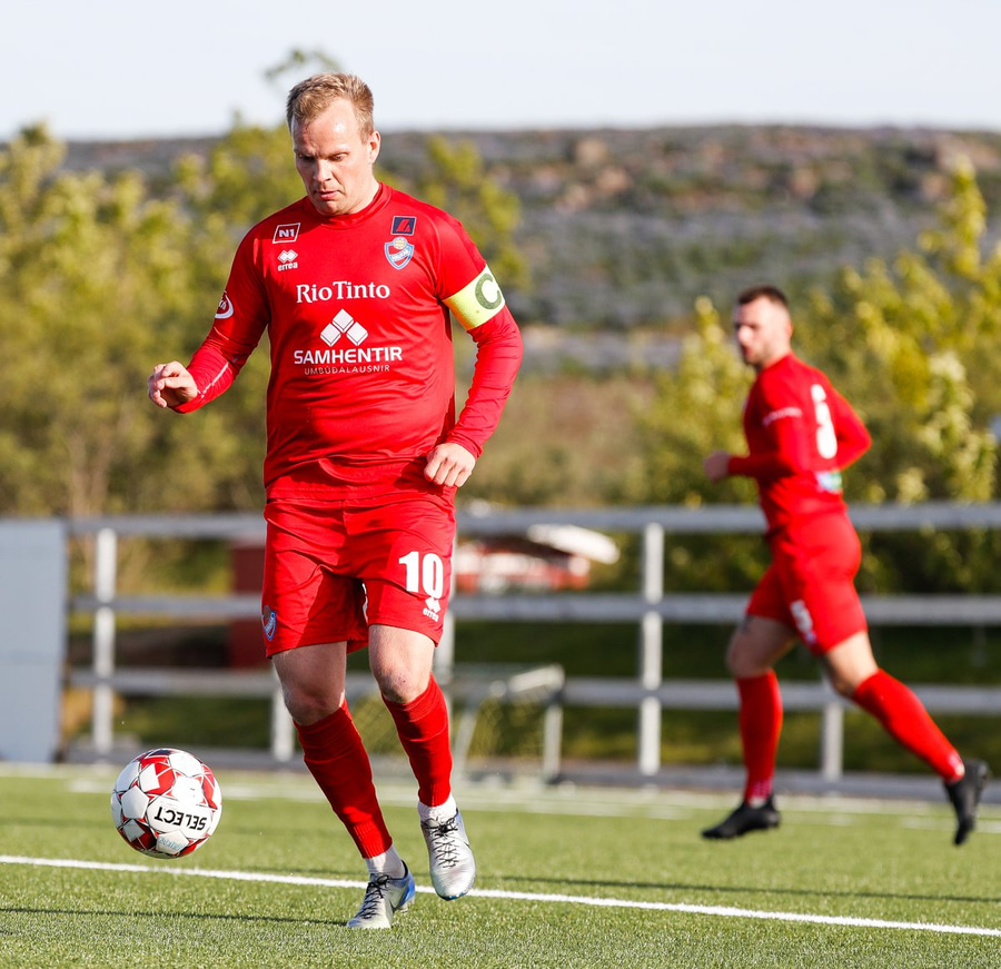 Sveinn Elías í færi hægra megin í teignum eftir glæsilega fyrirgjöf frá Jónasi Björgvini og boltinn fer á milli manna áður en Óskar hansdamar boltann.